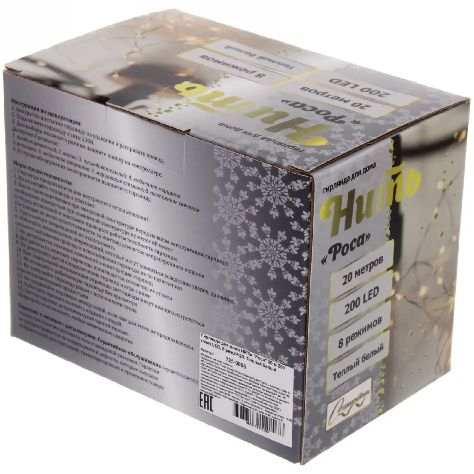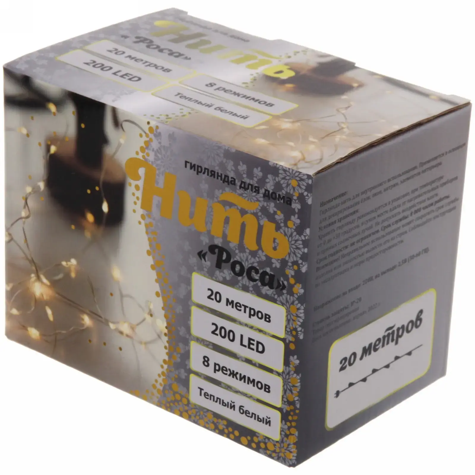 Гирлянда для дома НИТЬ «Роса» 20 м 200 ламп LED, 8 реж,IP-20, Теплый белый