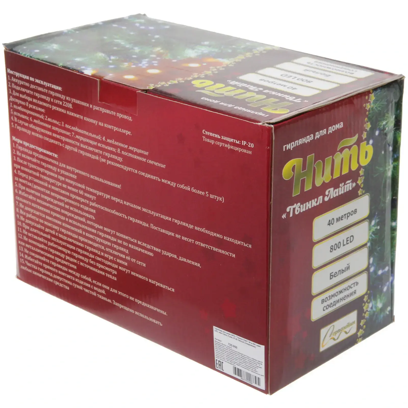 Гирлянда выполнена из качественных материалов: металл и пластик, что обеспечивает ее долговечность и надежность. Длина гирлянды составляет 40 метров, а количество светодиодов — 800, что позволяет равномерно освещать большие пространства. Степень защиты IP-20 гарантирует безопасность использования внутри помещений. Не упустите возможность сделать ваш дом более уютным и красивым с гирляндой 'Твинкл Лайт'!