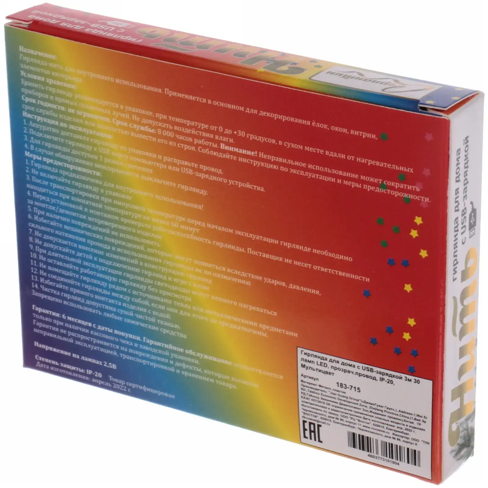 Гирлянда выполнена из качественных материалов: металл и пластик, что обеспечивает её надежность и долговечность. Степень защиты IP-20 позволяет использовать гирлянду в помещениях, защищая её от пыли и легких загрязнений. Размеры гирлянды составляют 3 метра, а количество светодиодов — 30, что позволяет создать эффектное освещение на больших площадях.