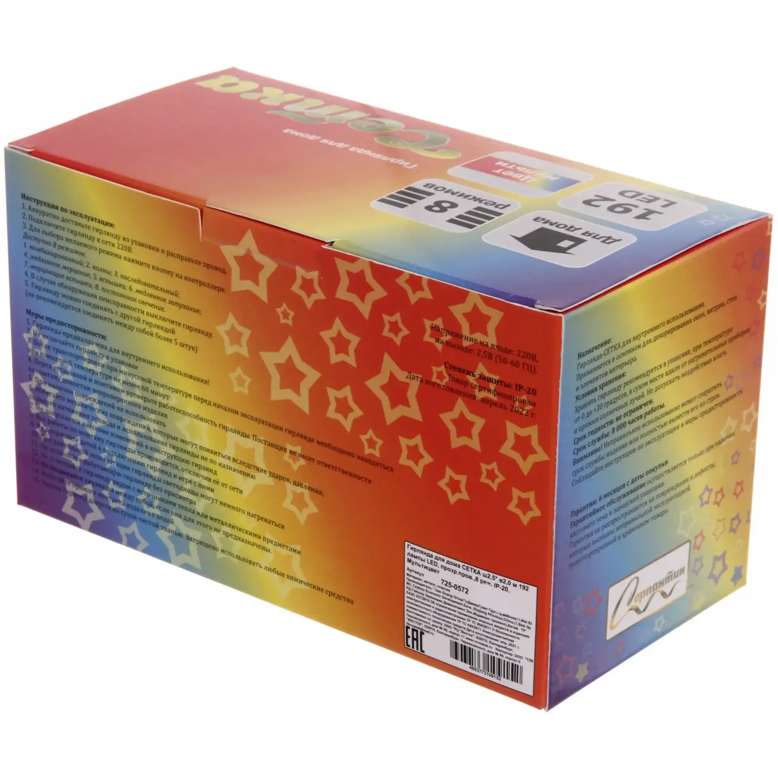 Гирлянда выполнена из металла и пластика, что обеспечивает ее устойчивость к внешним воздействиям. Она имеет степень защиты IP-20, что делает ее безопасной для использования в помещениях. Не упустите возможность преобразить ваше пространство с помощью этой яркой и стильной гирлянды-сетки!