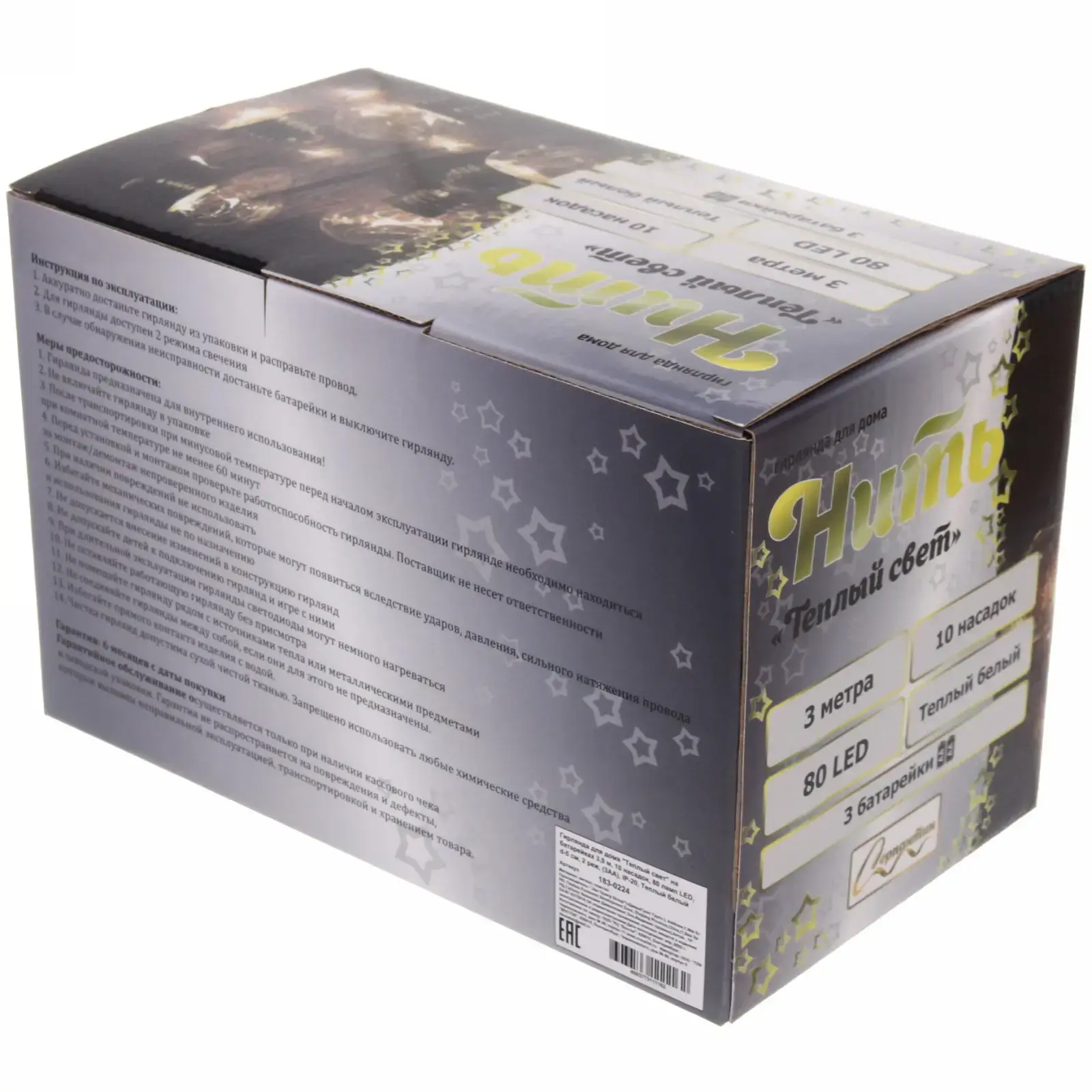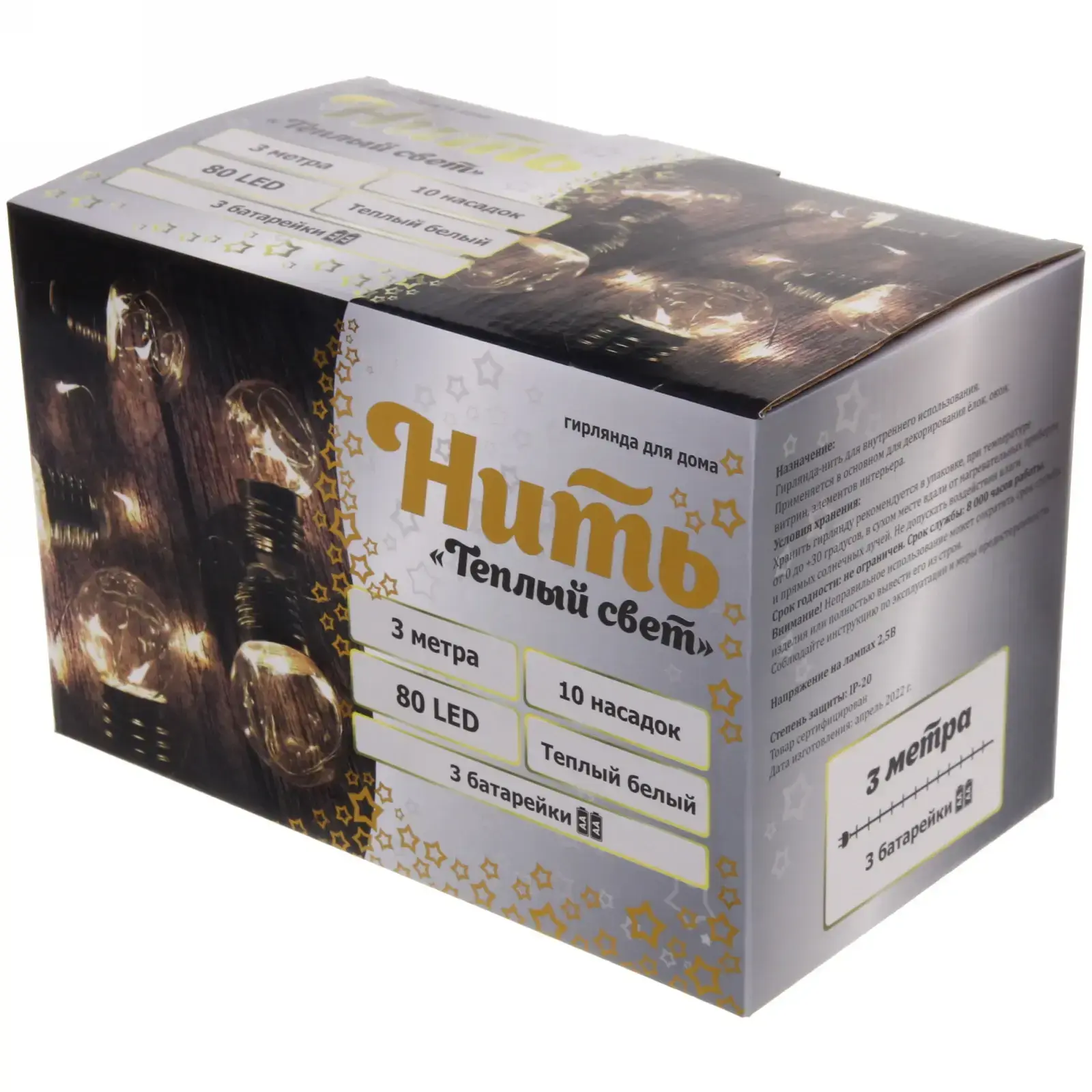 Гирлянда для дома «Теплый свет» на батарейках 3,0 м, 10 насадок, 80 ламп LED, d-5 см, 2 реж, (3АА), IP-20, Теплый белый