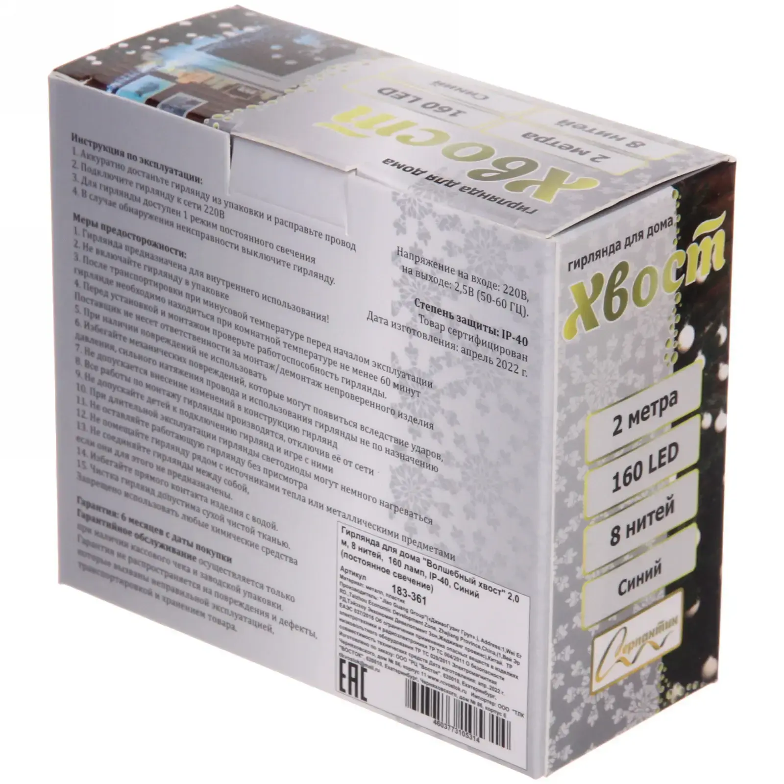 Гирлянда выполнена из качественных материалов: металл и пластик, что обеспечивает ее надежность и долговечность. Длина гирлянды составляет 2 метра, а количество светодиодов — 160, что позволяет создать яркое и эффектное освещение. Синий цвет огоньков добавляет нотку волшебства и загадочности, делая ваш декор по-настоящему уникальным.