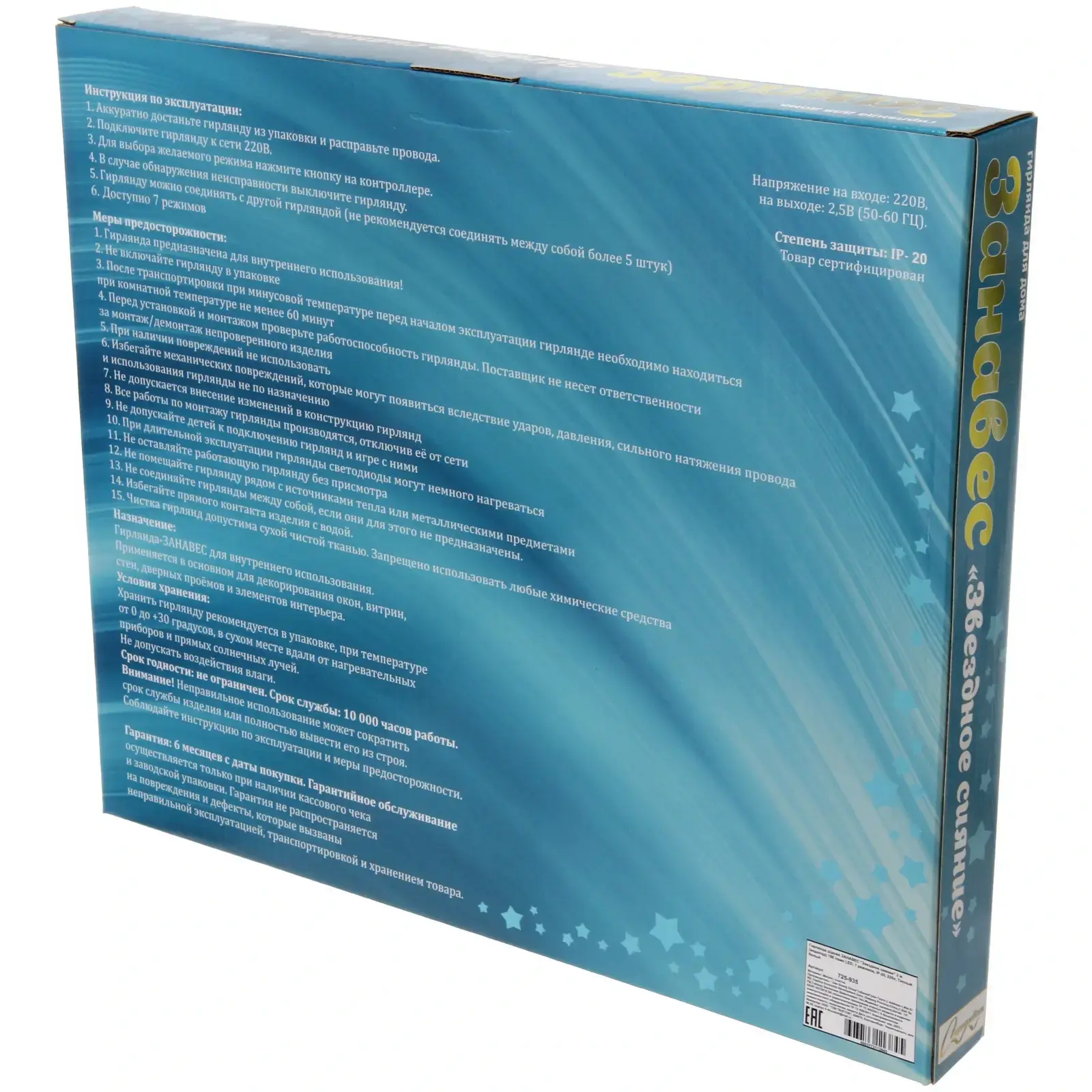 Гирлянда выполнена из качественных материалов: металл и пластик, что обеспечивает долговечность и надежность. Она работает от сети 220V, что делает ее удобной в использовании. Не упустите возможность сделать ваш дом более красивым и уютным с гирляндой ЗАНАВЕС «Звездное сияние»!