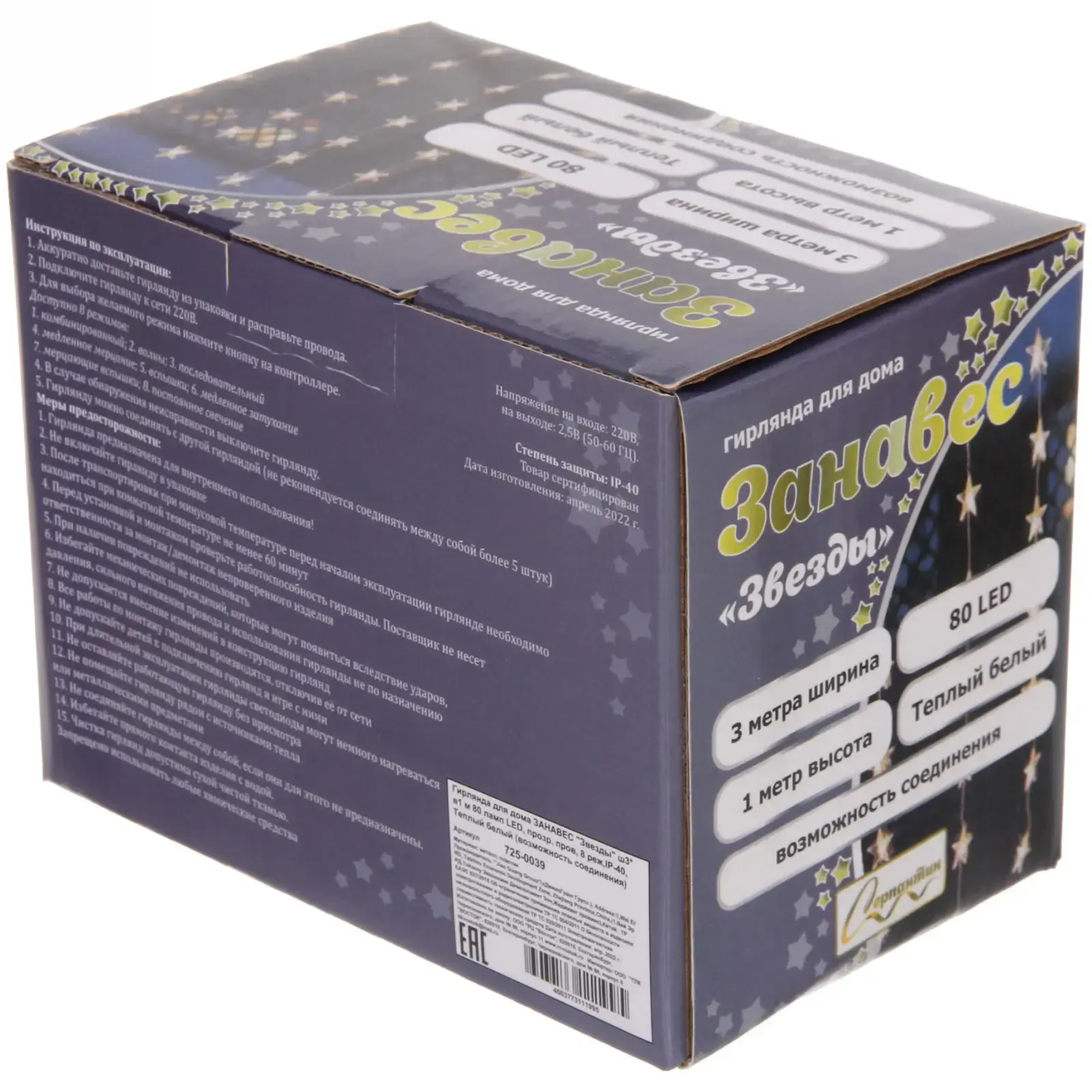 Гирлянда 'Занавес Звезды' создает неповторимую атмосферу праздника и уюта. Мягкое мерцание 80 светодиодов наполнит помещение теплым светом.