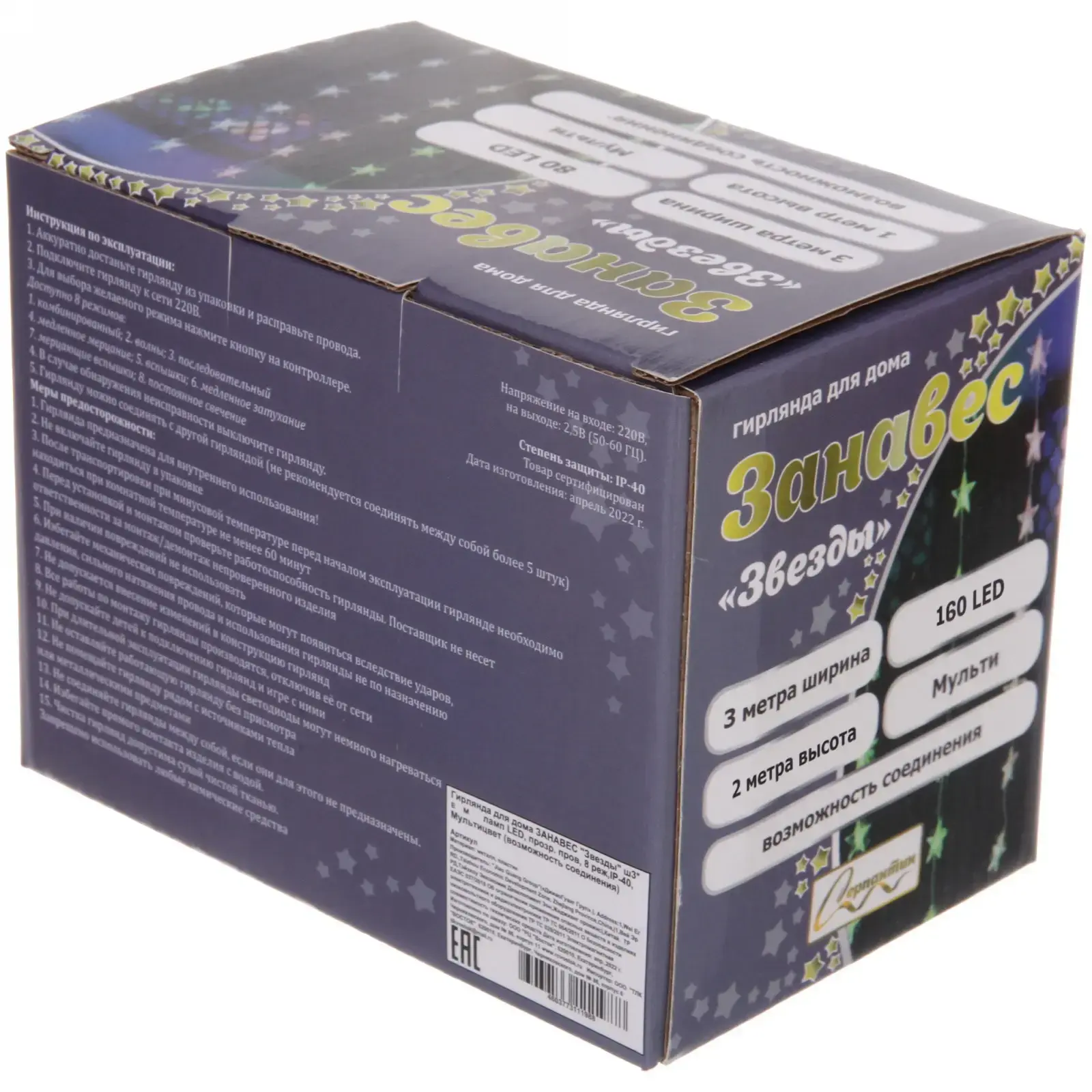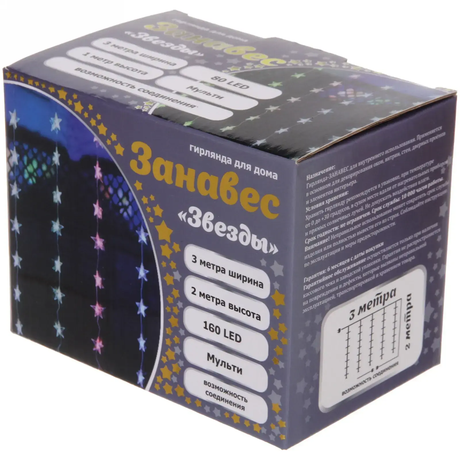 Гирлянда для дома ЗАНАВЕС «Звезды» ш3* в2 м 160 ламп LED, прозр. пров, 8 реж,IP-40, Мультицвет (возможность соединения)