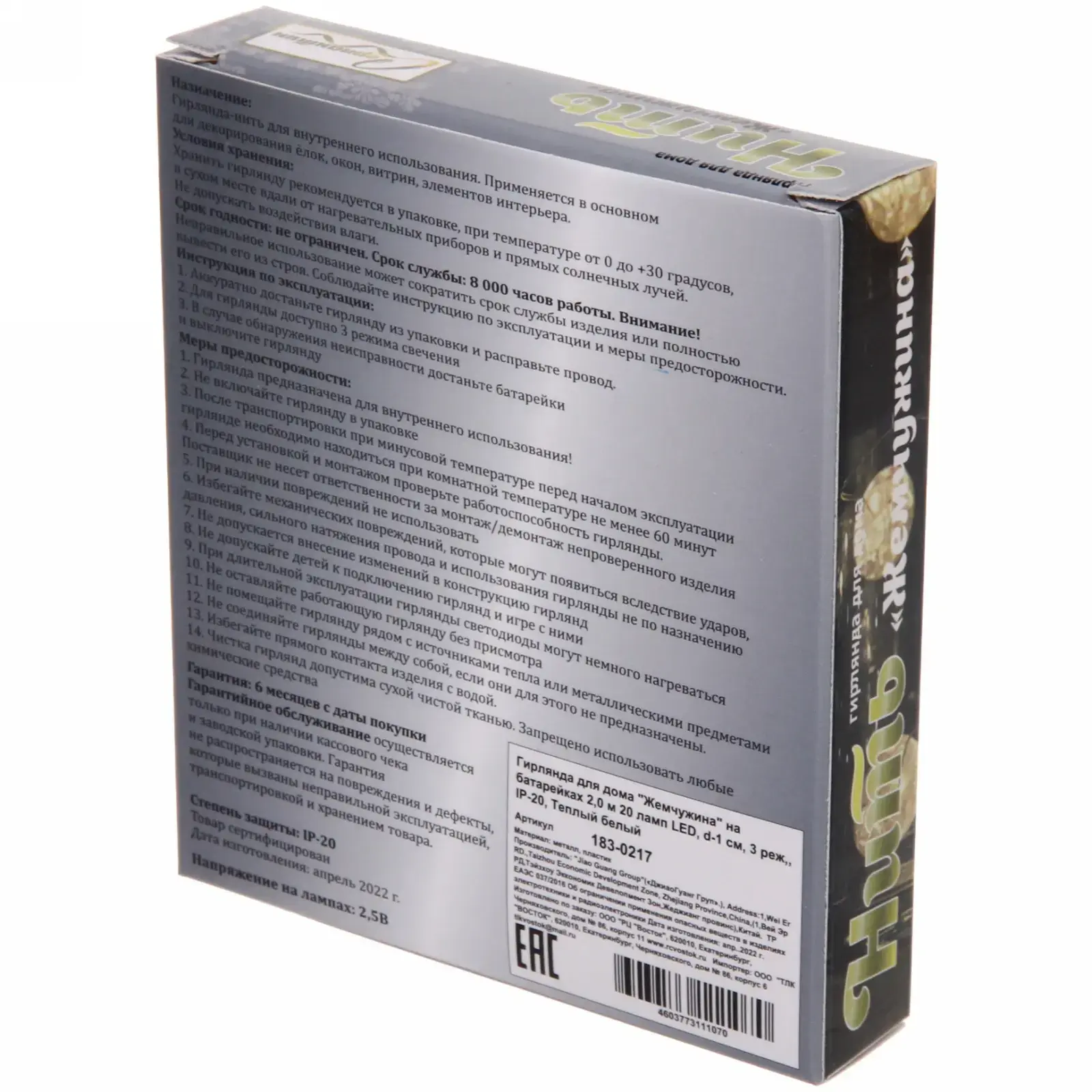 Гирлянда для дома «Жемчужина» на батарейках 2,0 м 20 ламп LED, d-1 см, 3 реж,, IP-20, Теплый белый