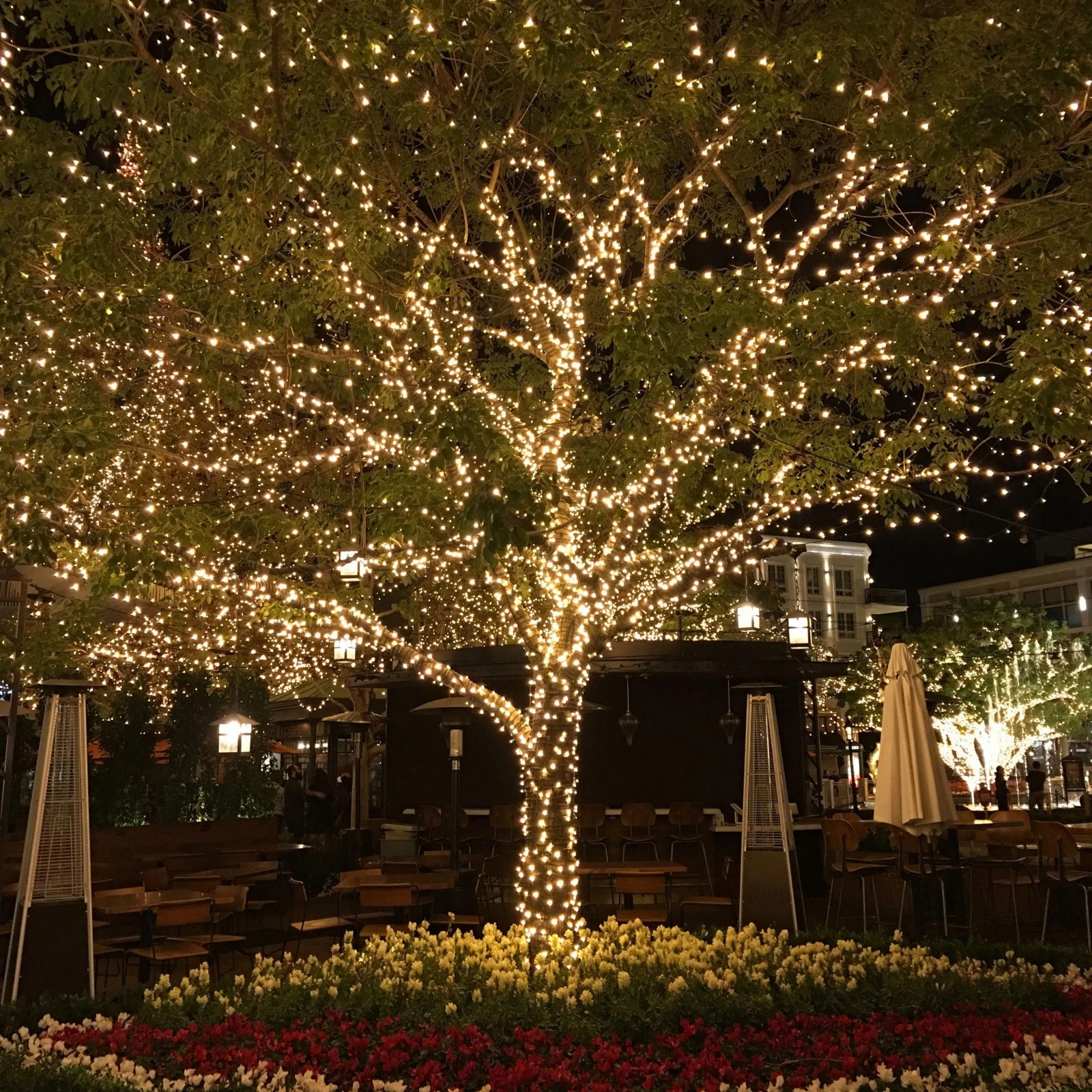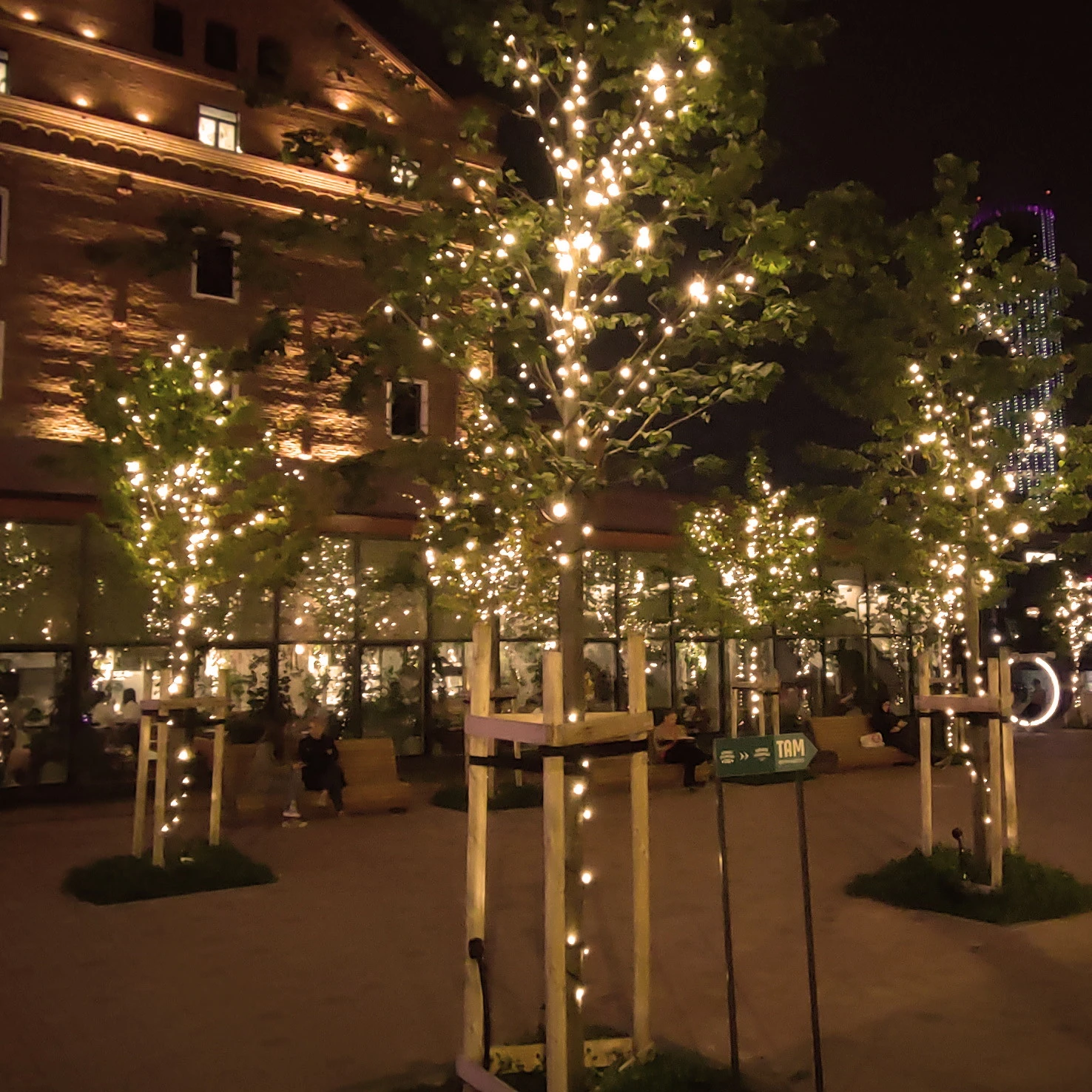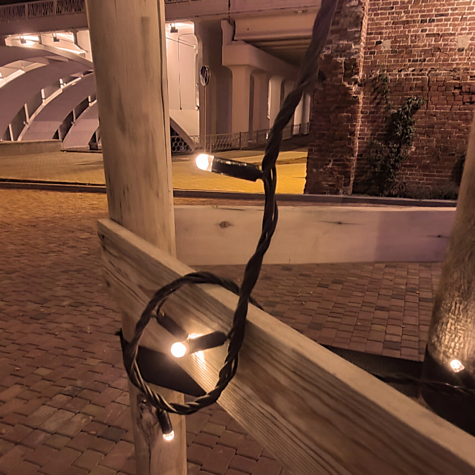 Черный провод аккуратно смотрится на фоне ветвей и темных поверхностей, не отвлекая внимание от свечения ламп.