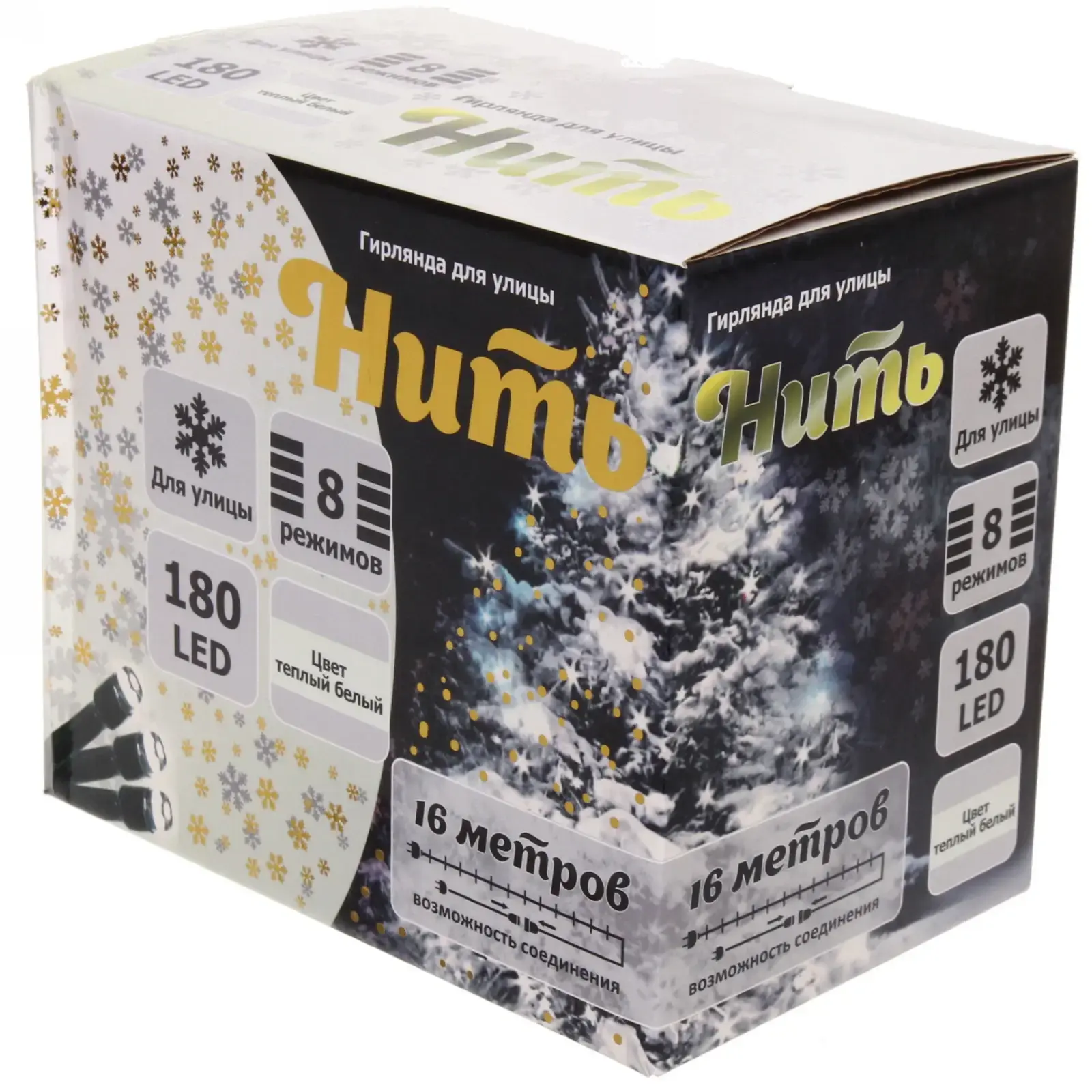 Гирлянда для улицы 16м 180 ламп LED чёрный провод, 8 реж. IP-65, Теплый белый (возможность соединения)