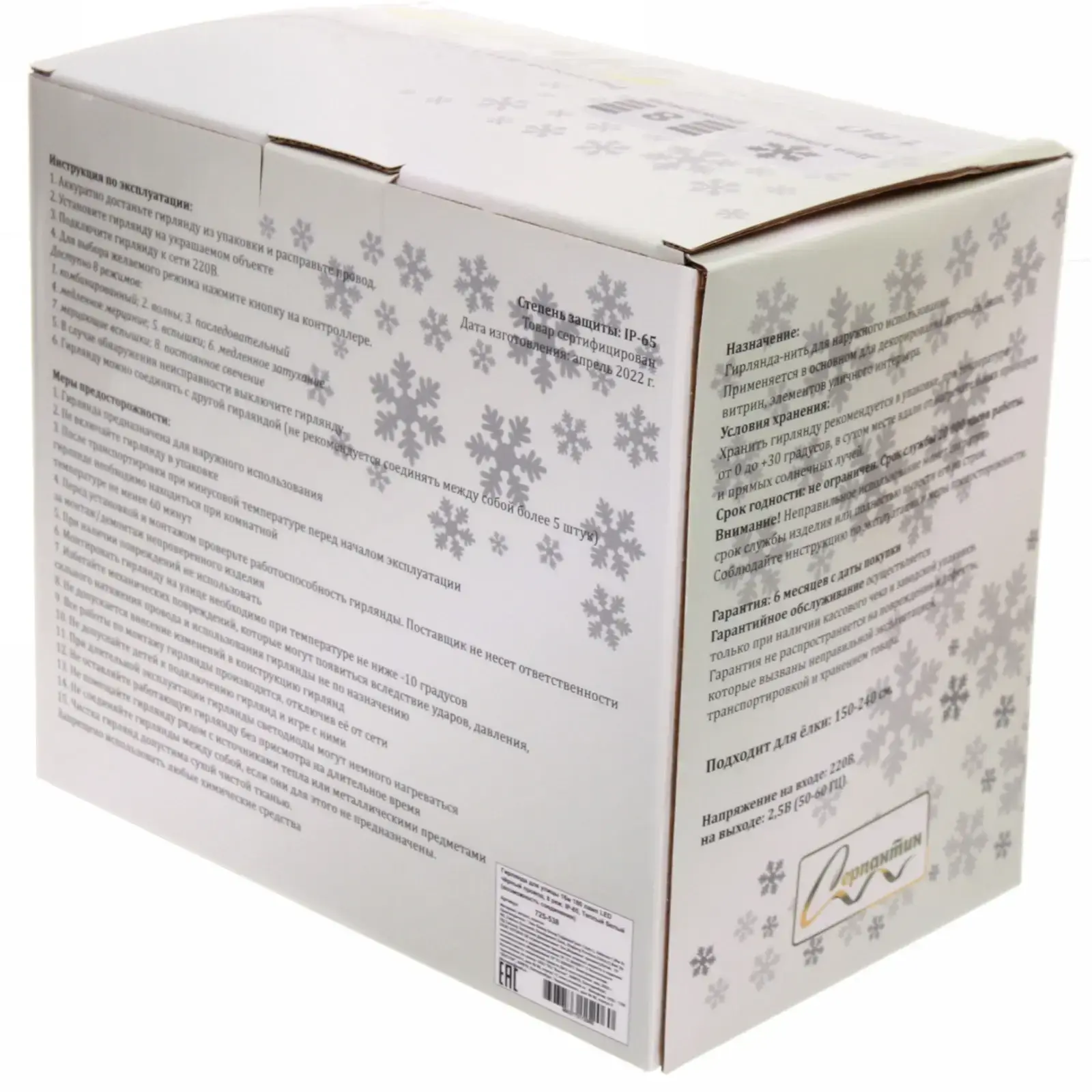 В комплекте: блок управления с кнопкой переключения режимов, евророзетка с заземлением. Подходит для постоянной эксплуатации с ноября по март — создавайте новогоднее настроение без лишних хлопот!