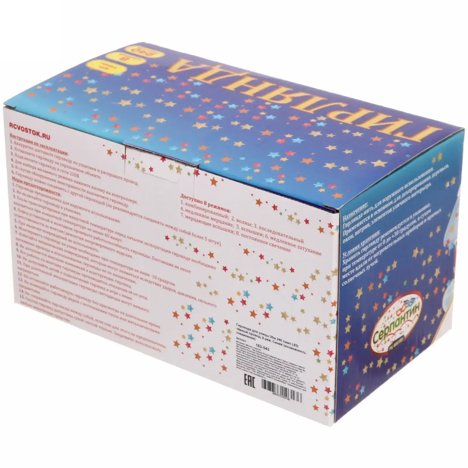 Гирлянда изготовлена из прочного металла и пластика, что делает её устойчивой к внешним воздействиям. Длина в 20 метров и количество ламп в 240 обеспечивают равномерное освещение на большой площади. Не упустите возможность сделать ваш праздник незабываемым с этой великолепной гирляндой!