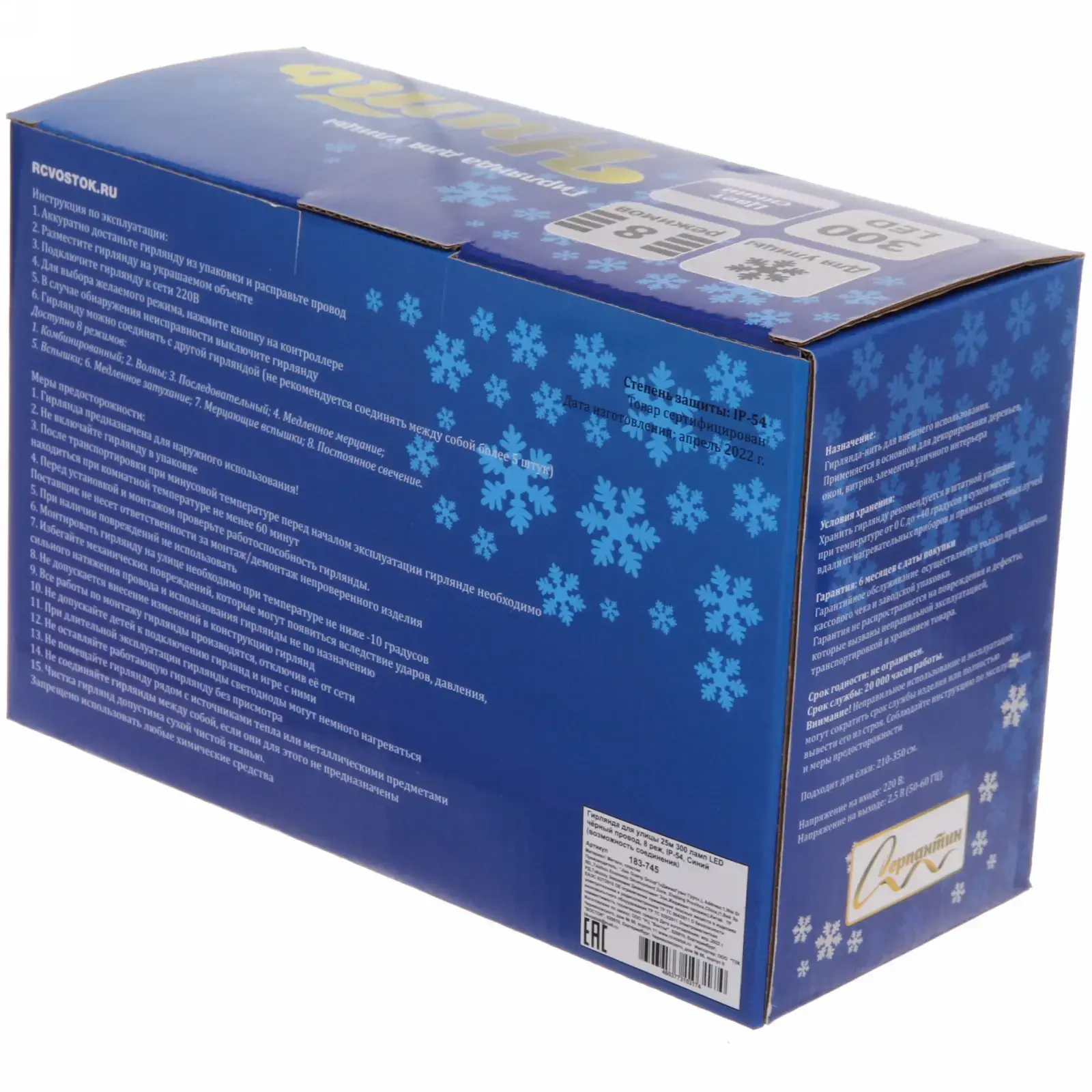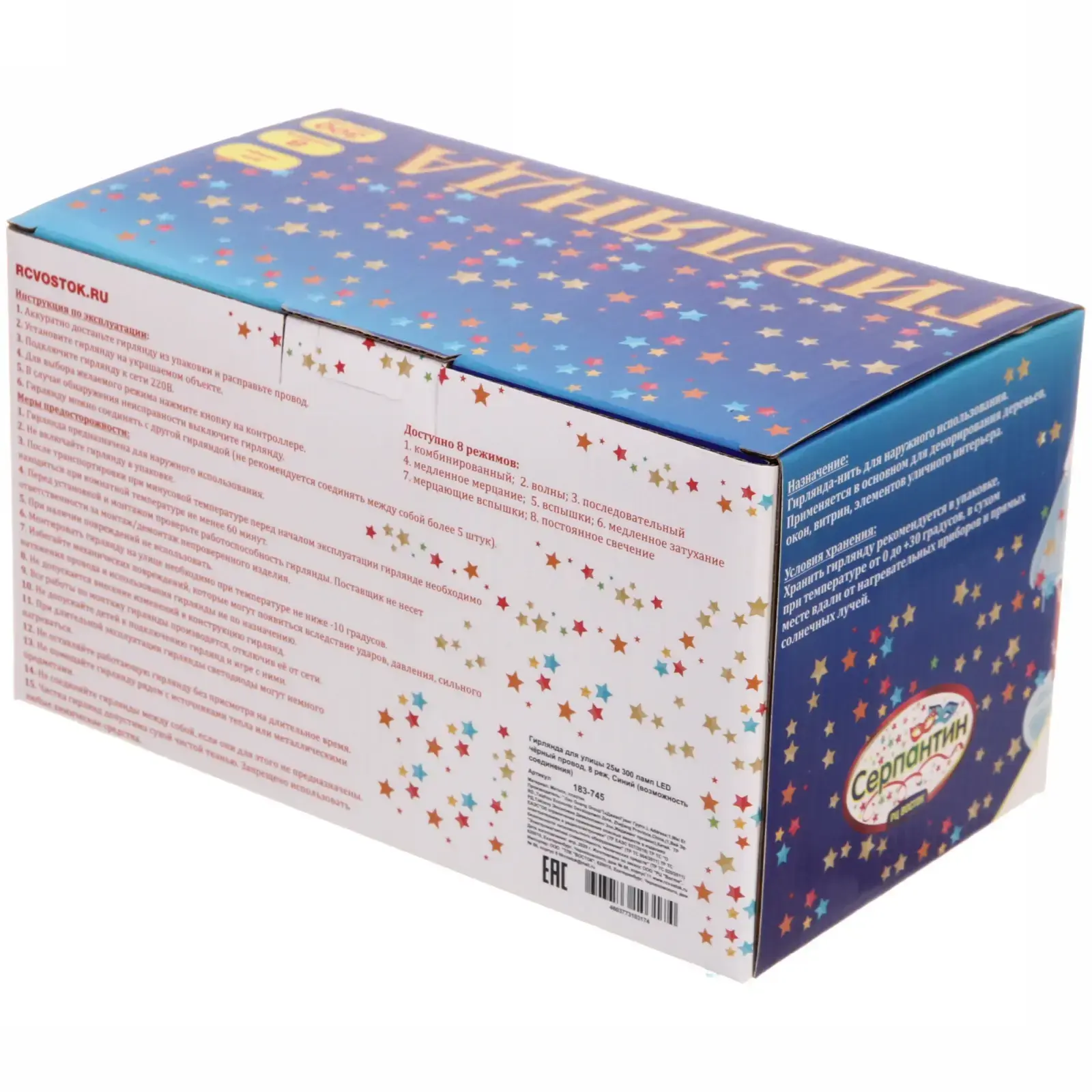 Гирлянда изготовлена из качественных материалов: металл и пластик обеспечивают её прочность и долговечность. Длина гирлянды составляет 25 метров, а количество ламп — 300, что позволяет равномерно освещать большие пространства. Упаковка включает инструкции по использованию и советы по эксплуатации, что делает процесс установки простым и понятным.