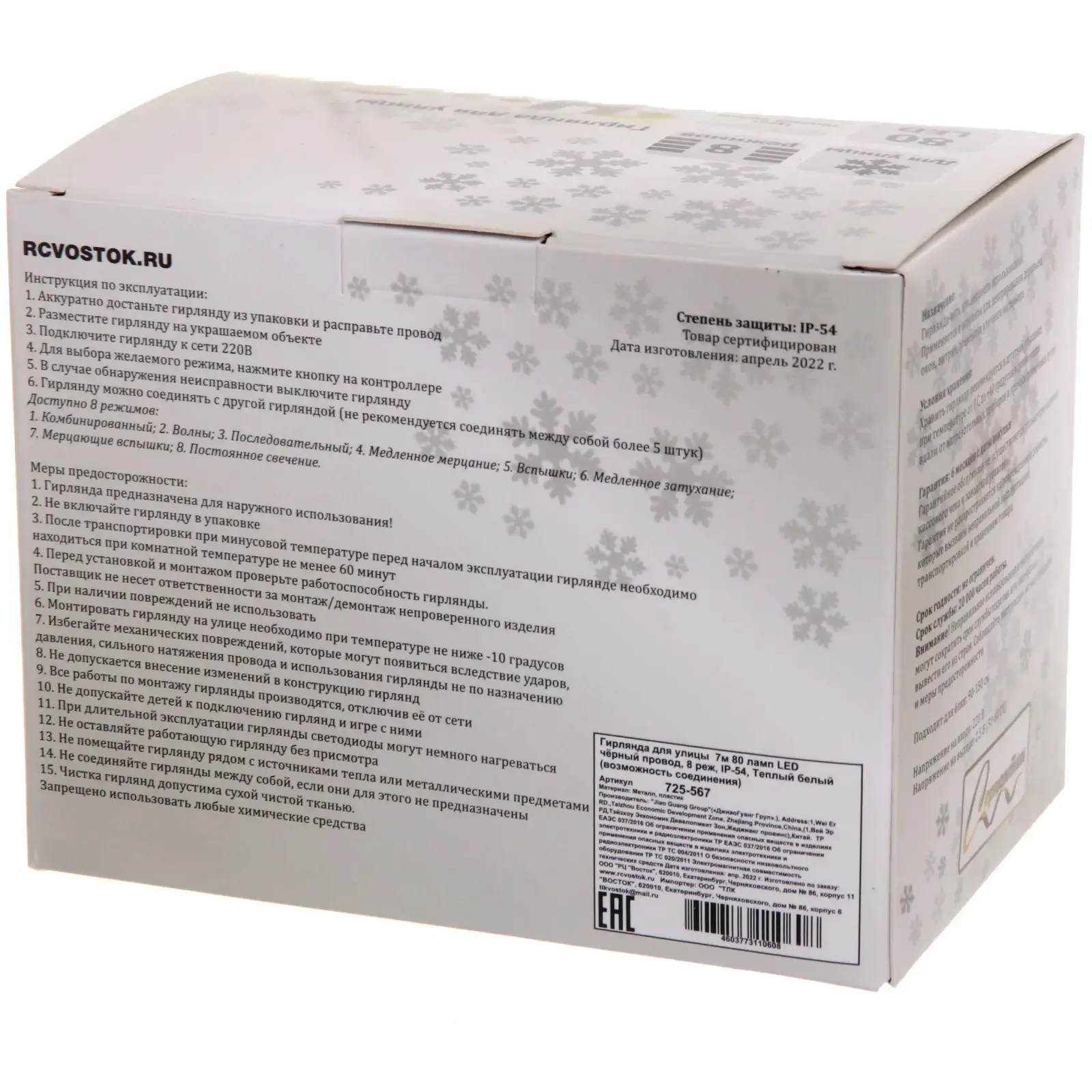 Эта гирлянда длиной 7 метров с 80 LED лампами и черным проводом станет идеальным решением для вашего уличного декора. С теплым белым светом и возможностью соединения нескольких гирлянд, она добавит уют и праздничное настроение в любое пространство. Благодаря степени защиты IP-54, гирлянда устойчива к воздействию влаги и пыли, что делает её идеальной для использования на улице в любое время года.