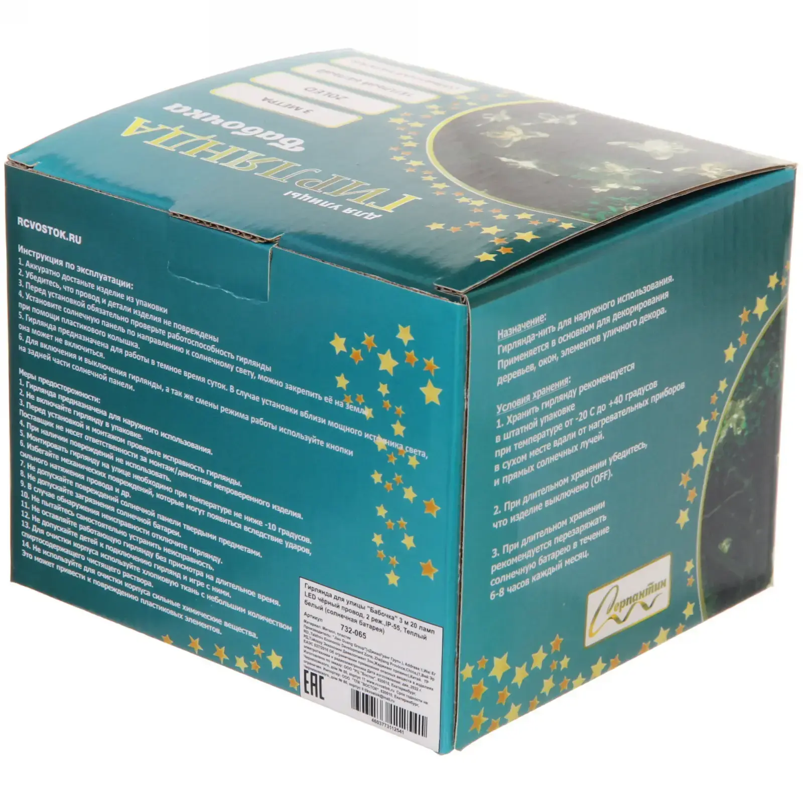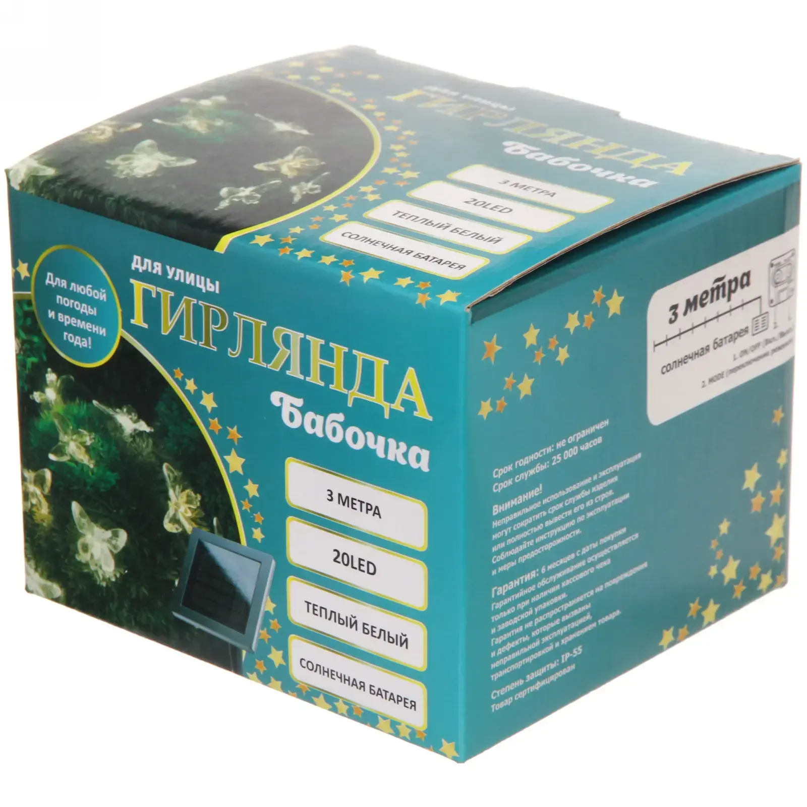 Создайте уютную атмосферу на вашем участке с гирляндой для улицы «Бабочка». Эта гирлянда длиной 3 метра с 20 светодиодными лампами обеспечит теплое и мягкое освещение, которое идеально подходит для вечерних встреч на свежем воздухе. Благодаря солнечной батарее, гирлянда не требует подключения к электросети, что делает её удобной и практичной для использования в любых условиях.