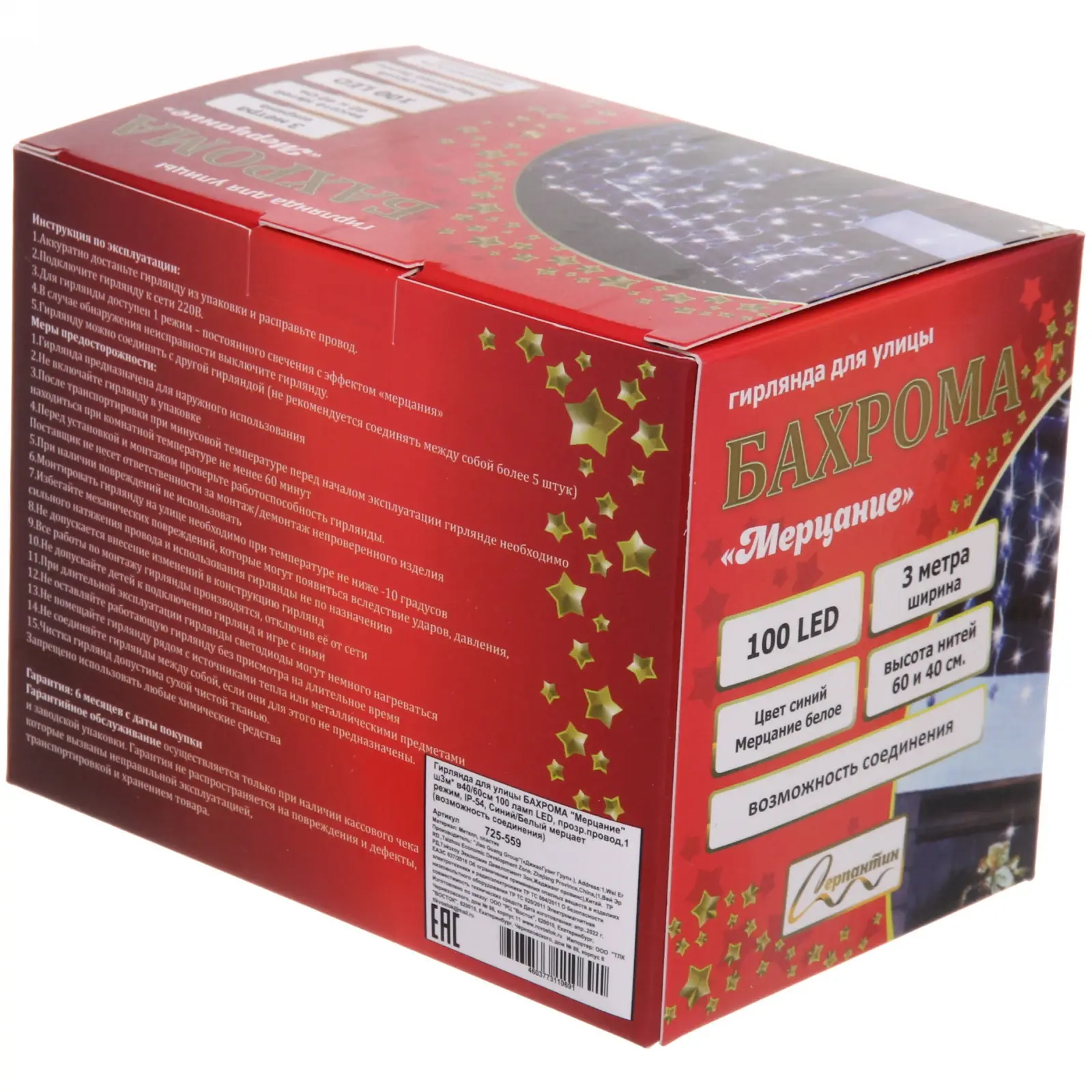 Гирлянда выполнена из прочного металлического каркаса и прозрачного пластика, что обеспечивает гибкость и визуальную лёгкость. Ширина ламп – 3 м, высота падающих нитей – 40 см и 60 см, общее количество светодиодов – 100 шт. Питание осуществляется от сети через адаптер, входной разъём имеет два контакта для надёжного соединения.