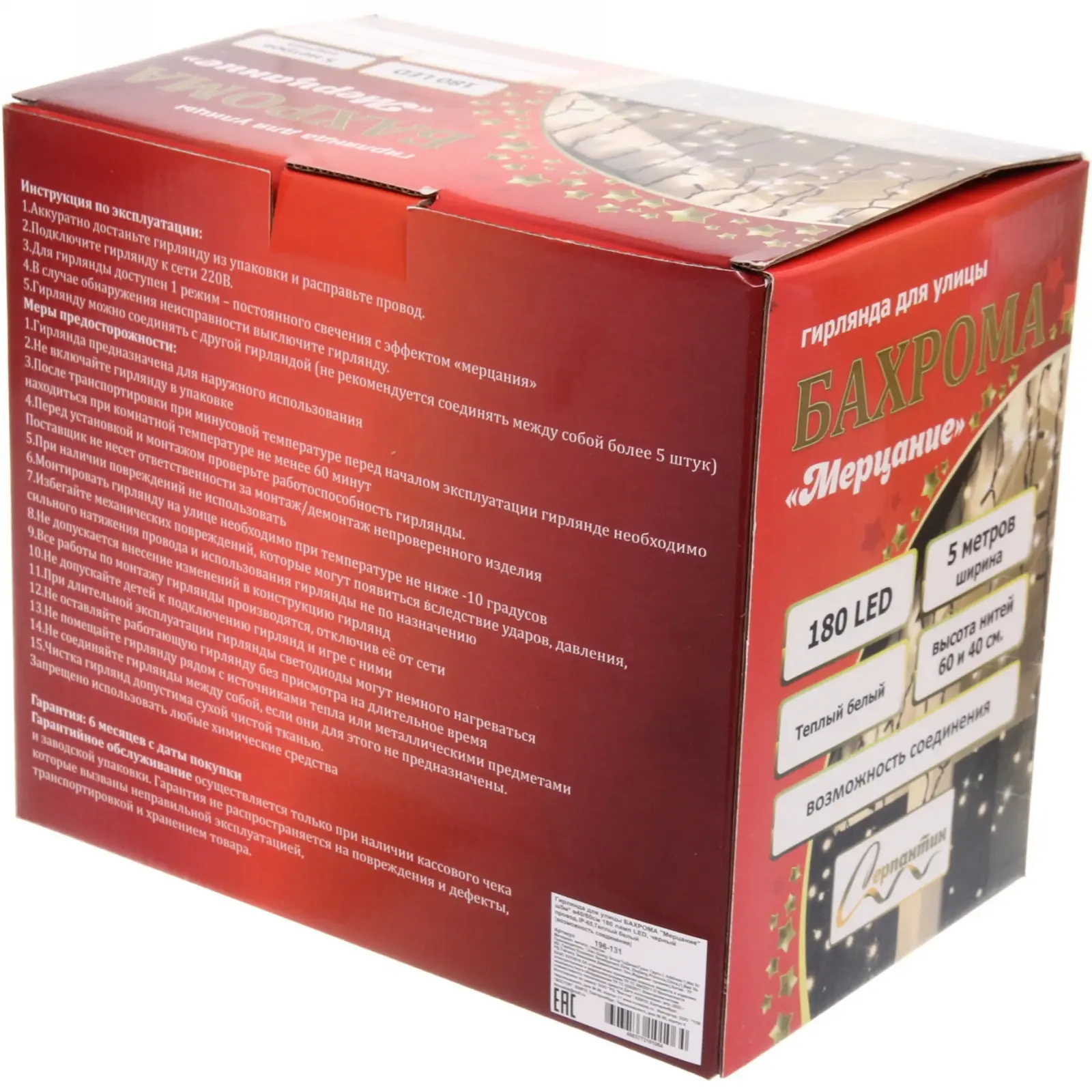 Создайте волшебную атмосферу с гирляндой БАХРОМА «Мерцание», которая станет идеальным решением для оформления вашего пространства. Эта гирлянда длиной 5 метров с 180 светодиодами создает эффект мерцания, напоминая звезды на ночном небе. Теплый белый свет добавляет уюта и делает любое мероприятие незабываемым.