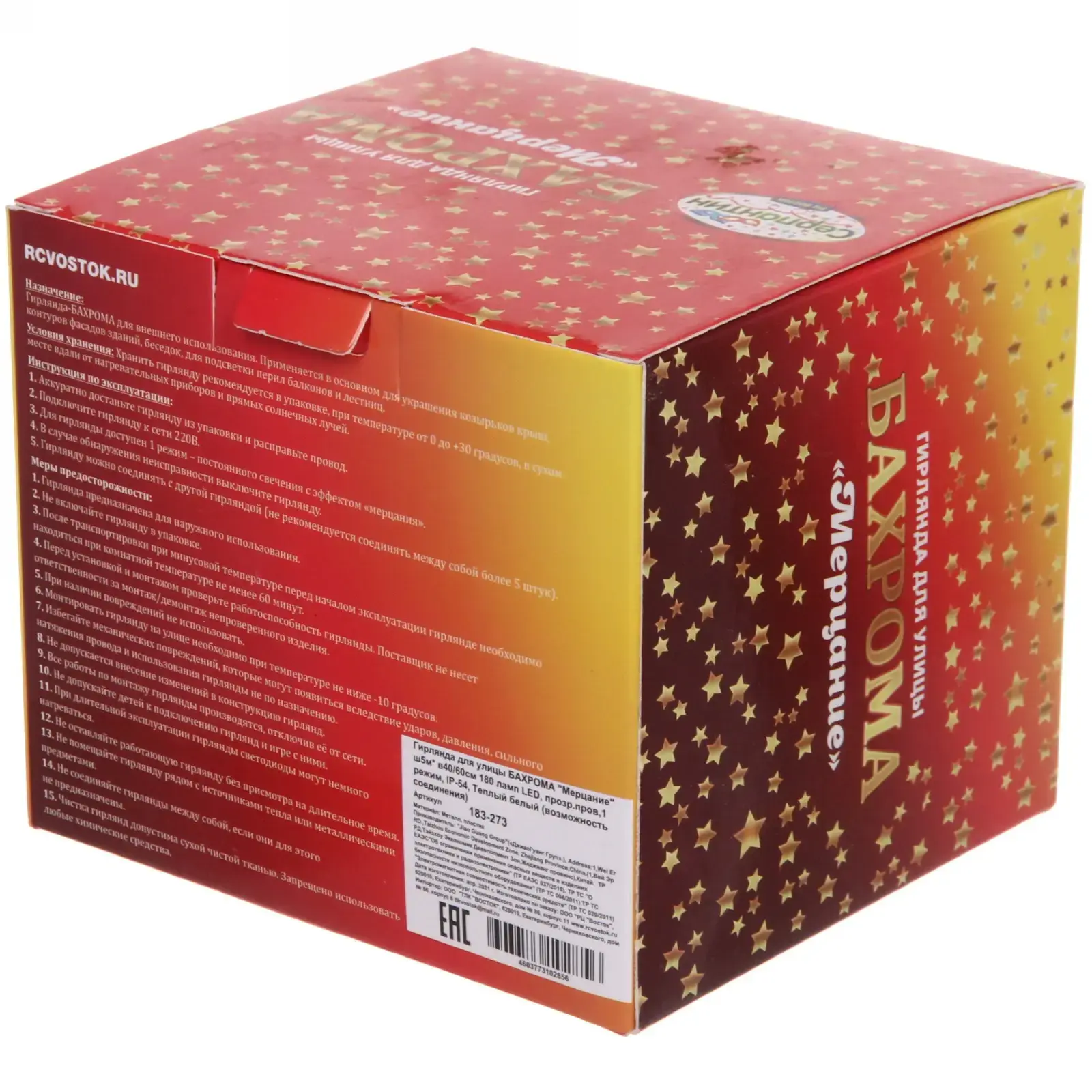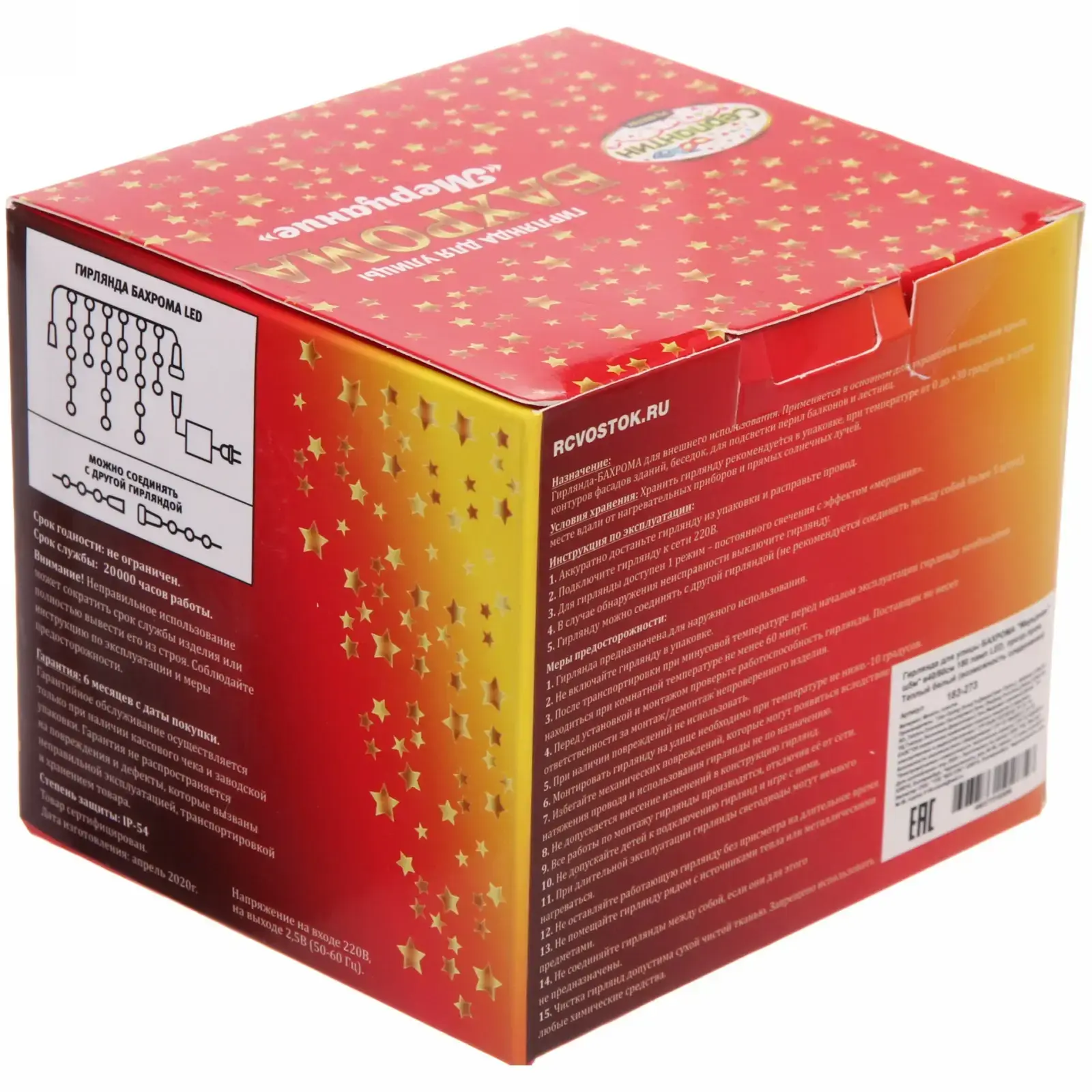 Гирлянда имеет размеры 5 метров в длину и 40/60 см в ширину, что позволяет легко адаптировать ее к любому пространству. Прозрачный провод делает гирлянду практически невидимой на фоне ночного неба, акцентируя внимание на ярких огоньках. Упаковка включает инструкции по подключению и использованию, что делает процесс установки еще более простым.