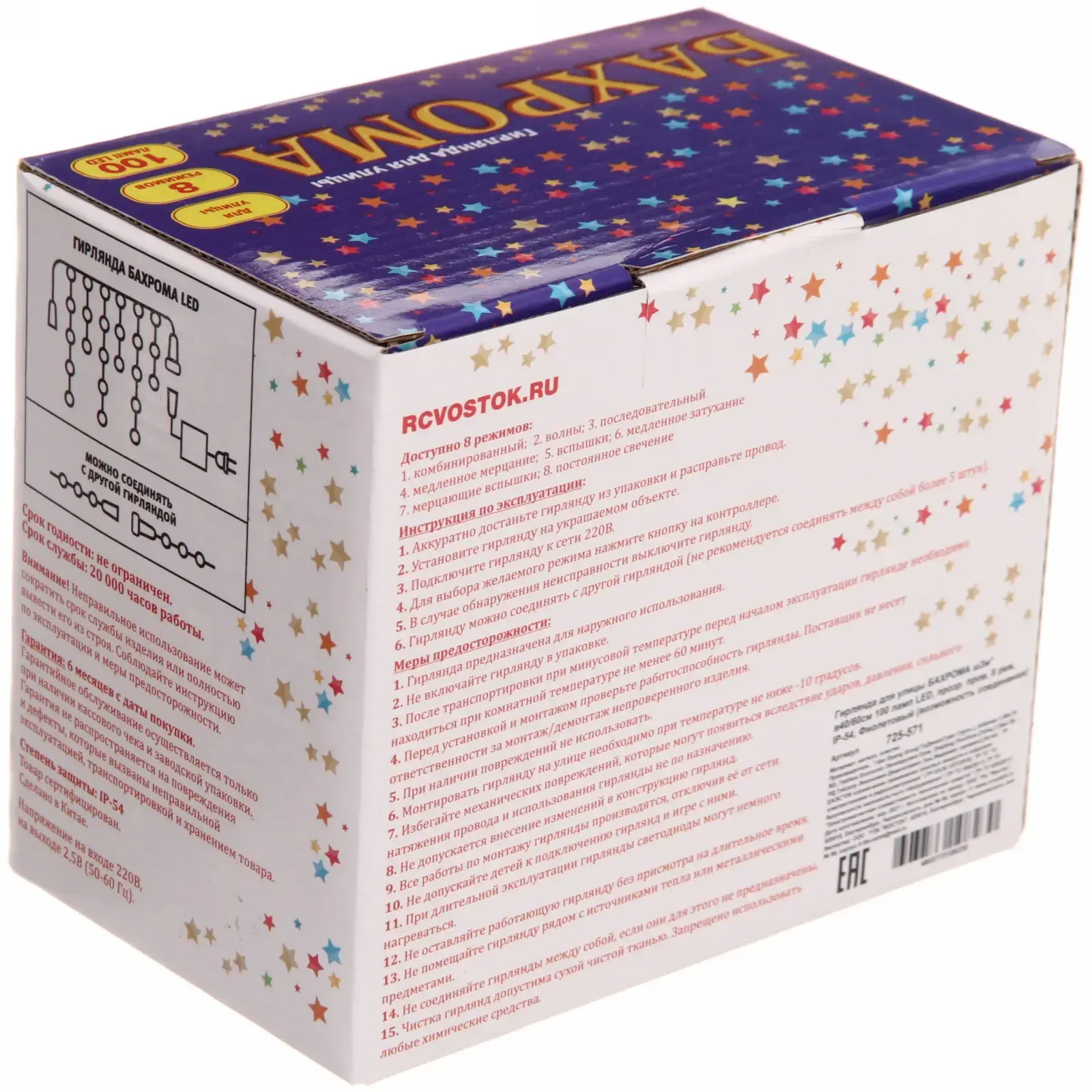 Гирлянда выполнена из качественных материалов, что обеспечивает её долговечность и надежность. Степень защиты IP-54 гарантирует, что она устойчива к воздействию влаги и пыли, что делает её идеальной для уличного использования. Прозрачный провод не отвлекает внимание от яркого света, а фиолетовый цвет добавляет изысканности.