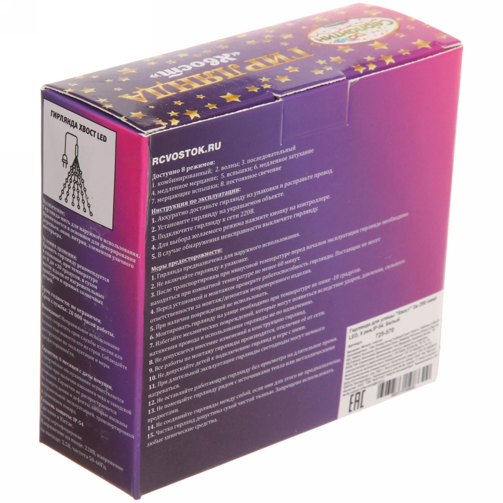 Гирлянда поставляется в удобной упаковке и готова к подключению. Достаточно выбрать режим — и пространство засияет мягким, чистым светом.