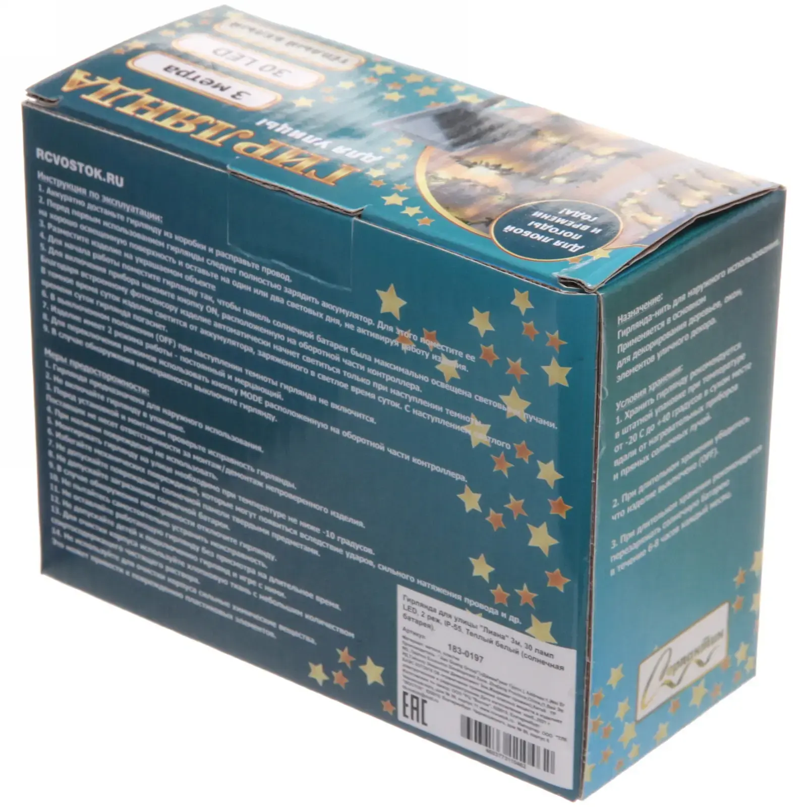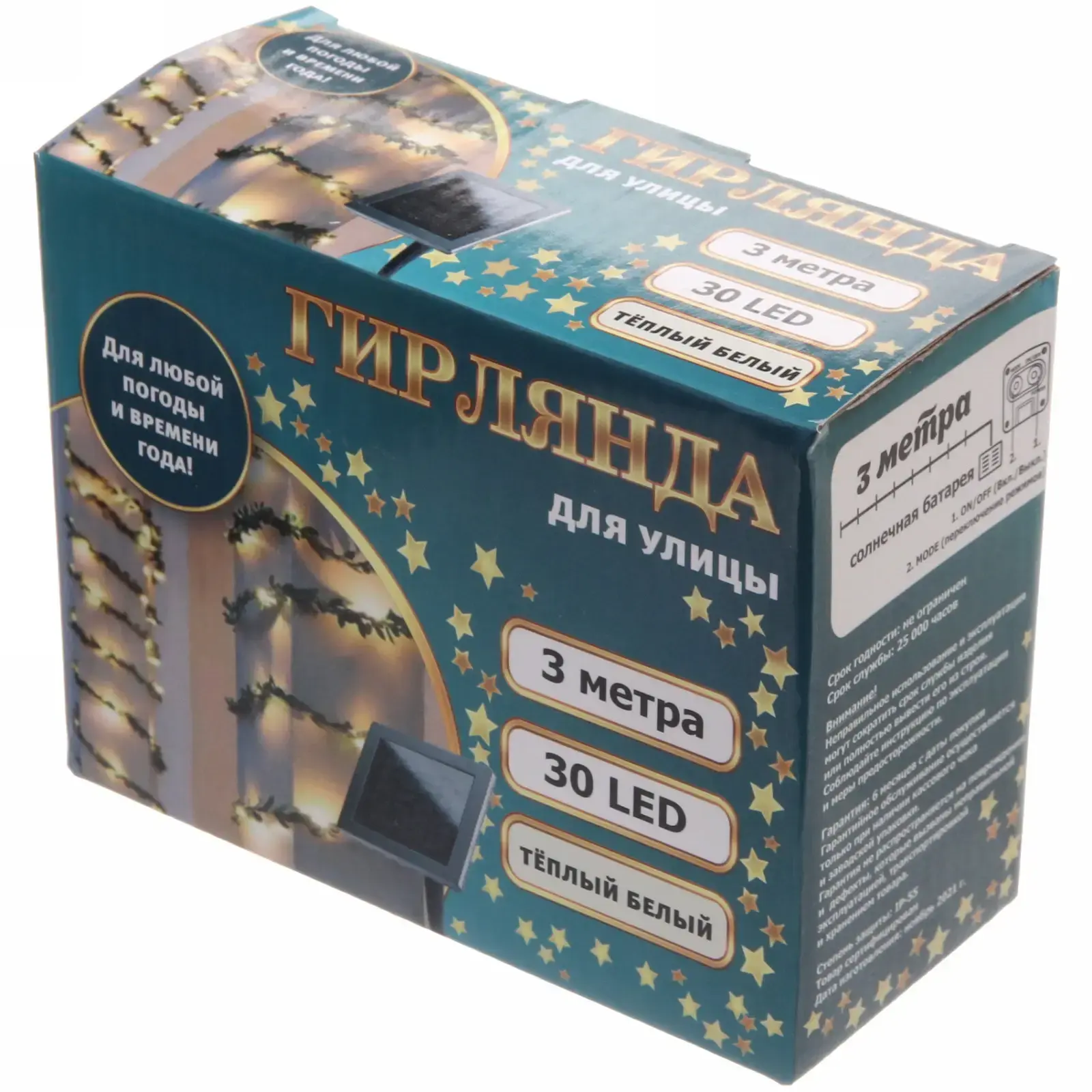 Гирлянда для улицы «Лиана» 3м, 30 ламп LED, 2 реж, IP-55, Теплый белый (солнечная батарея).