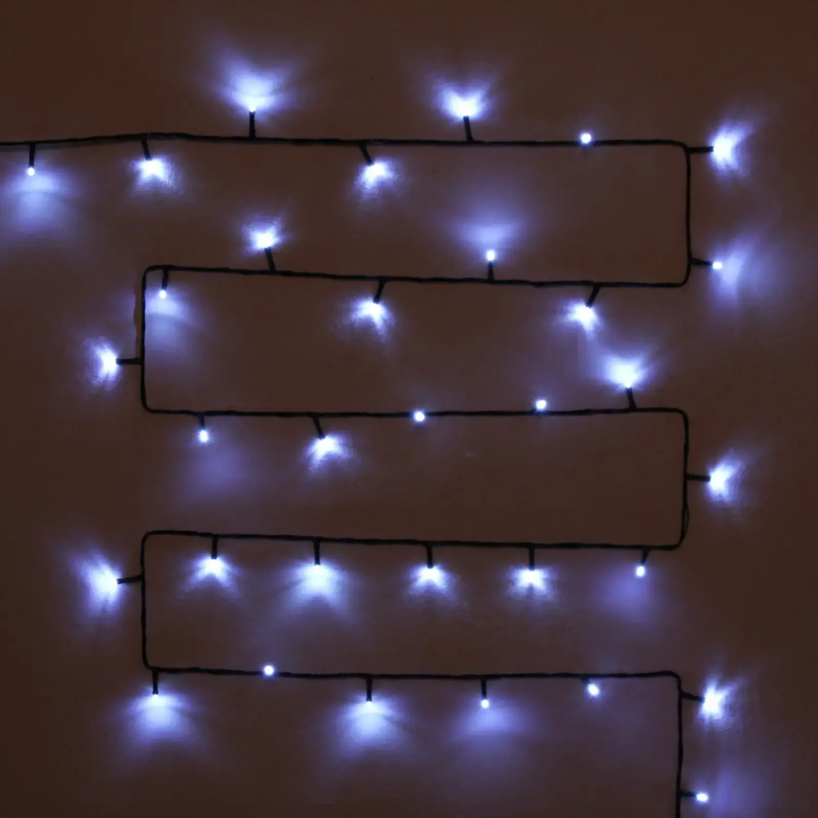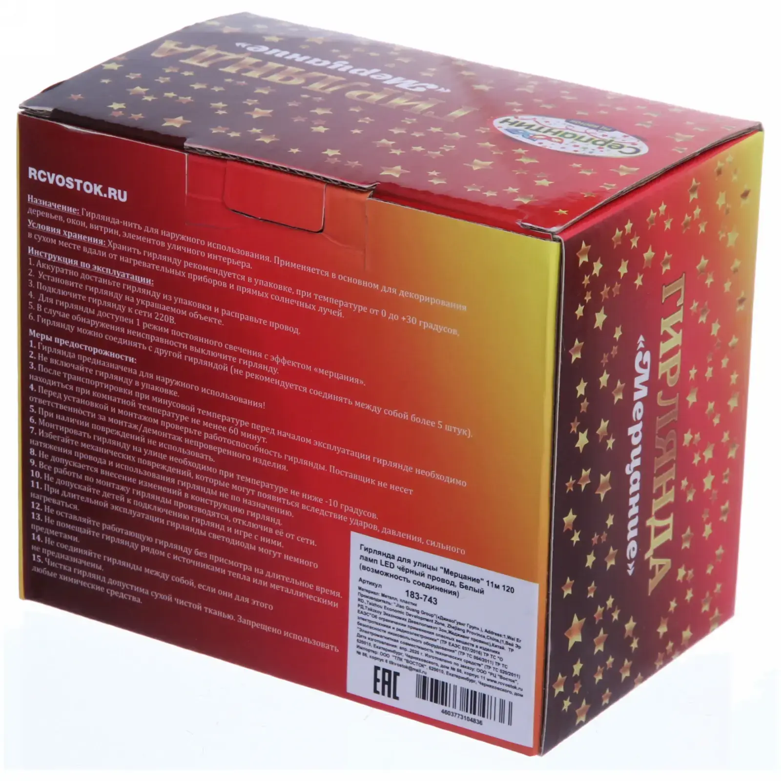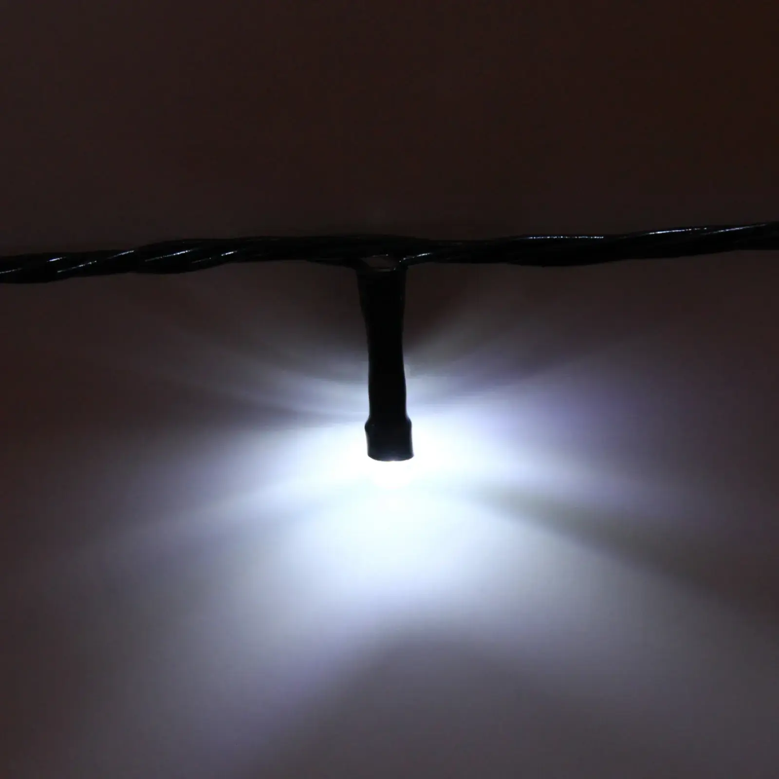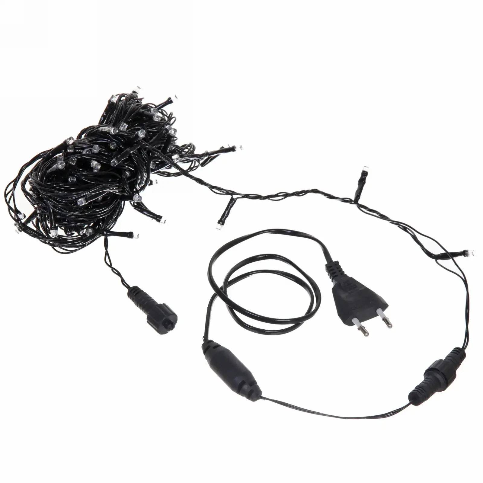 Гирлянда выполнена из качественных материалов: черный провод и белые светодиоды обеспечивают не только стильный внешний вид, но и надежность в эксплуатации. Длина гирлянды составляет 11 метров, что позволяет украсить большие пространства. Она имеет один режим свечения, который создает эффект мерцания, словно звезды на ночном небе.