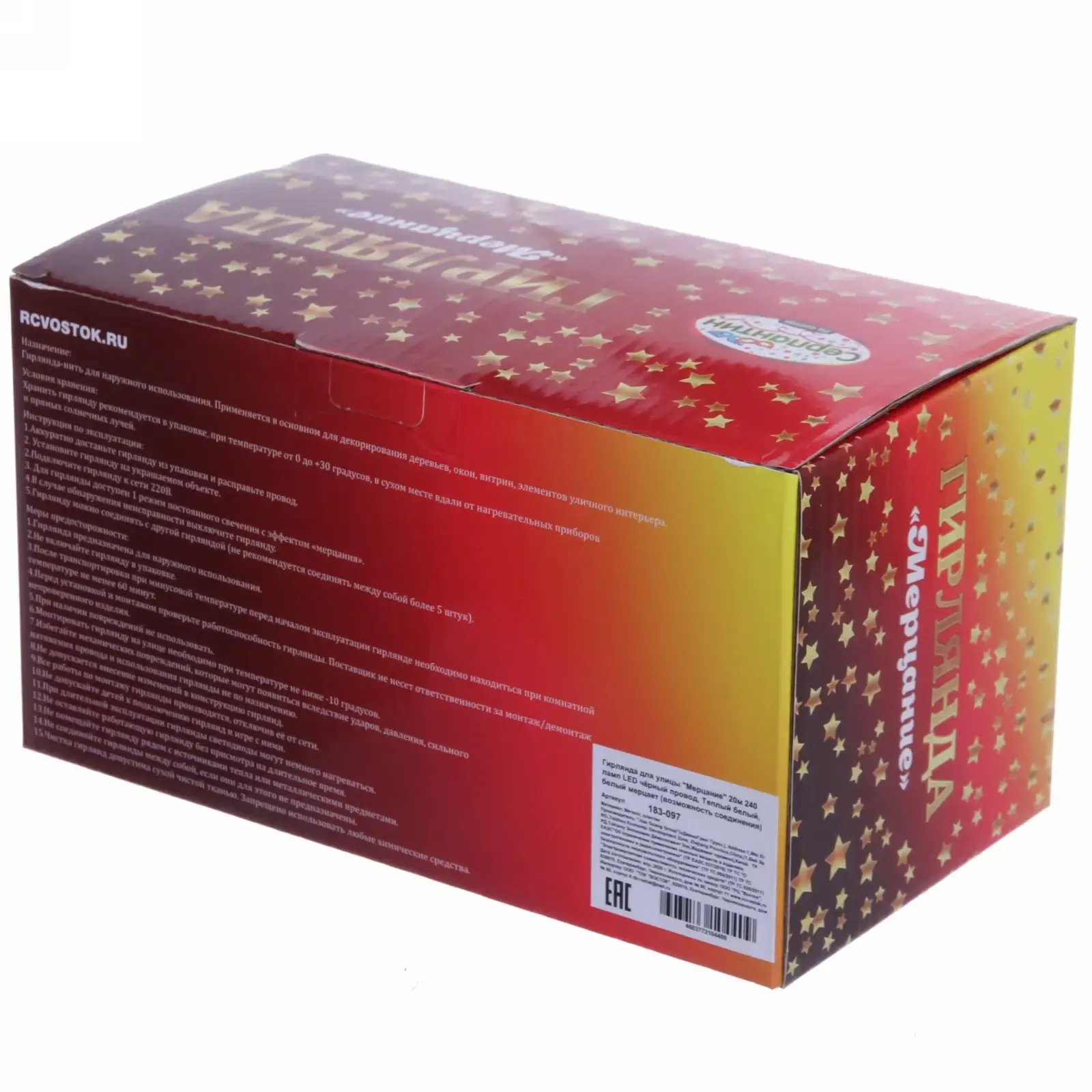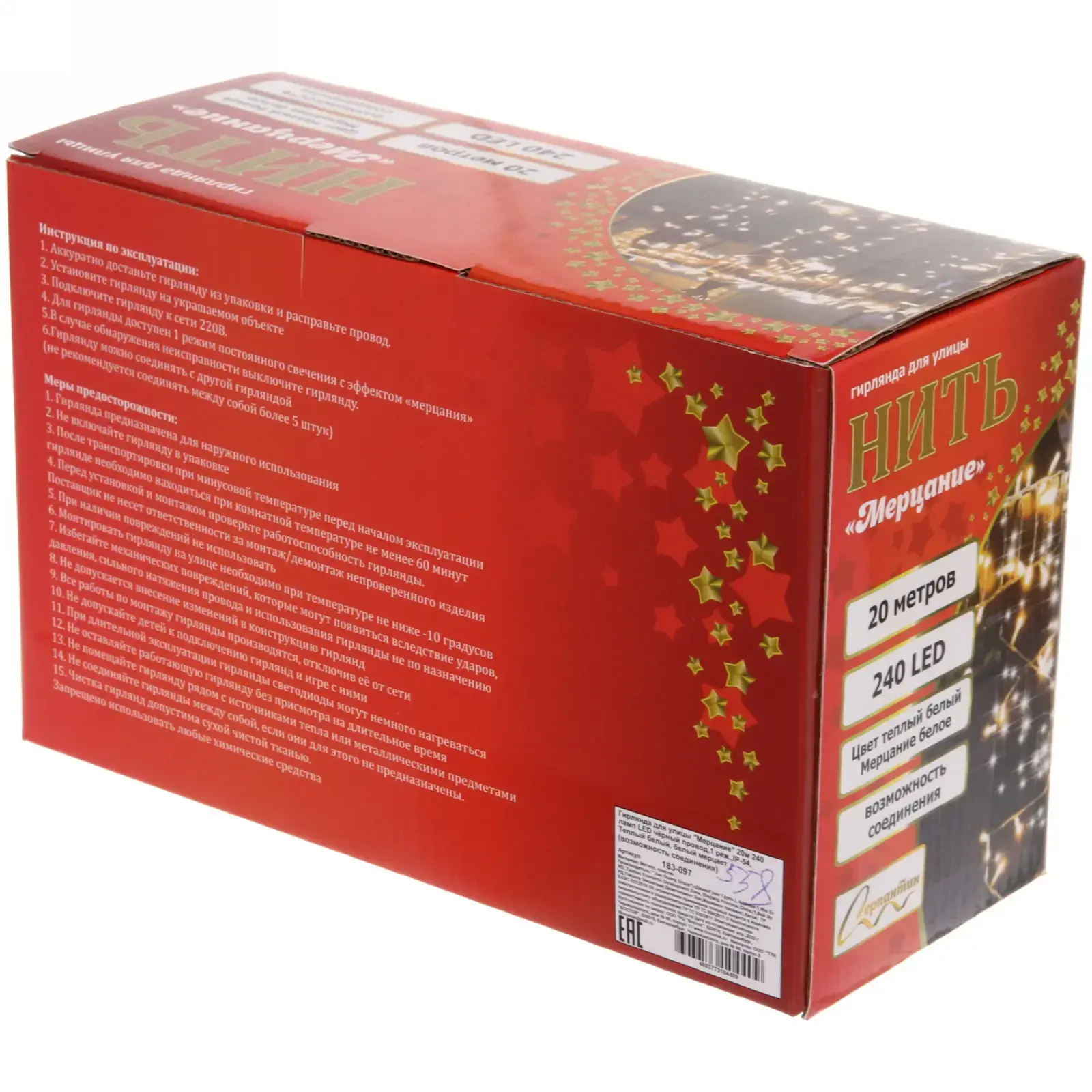 Гирлянда выполнена из качественных материалов: черный провод обеспечивает надежность и долговечность, а светодиоды обеспечивают яркое и равномерное освещение. Длина гирлянды составляет 20 метров, а количество ламп — 240, что позволяет охватить большие площади. Не упустите возможность сделать ваш праздник незабываемым с гирляндой «Мерцание»!