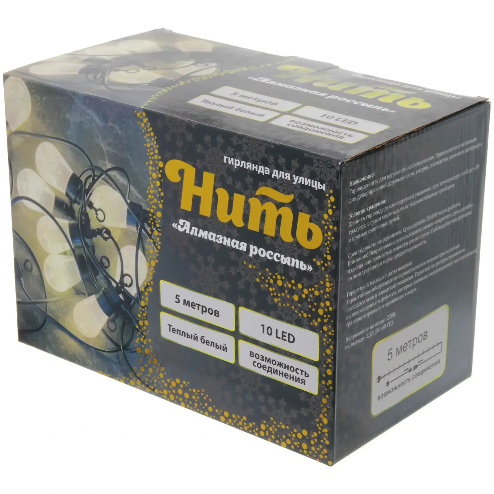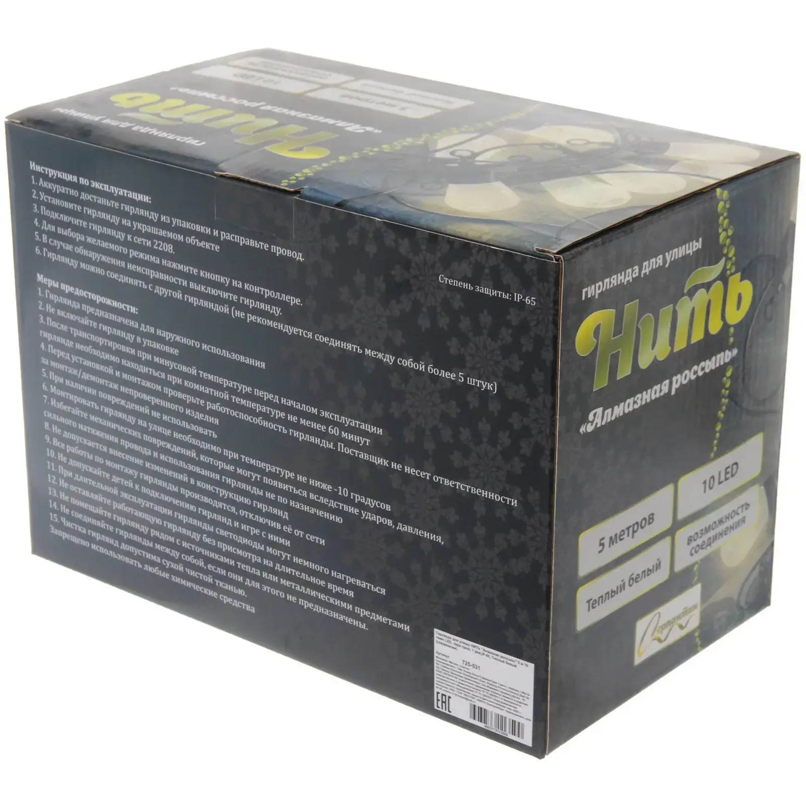 Выбирая гирлянду НИТЬ «Алмазная россыпь», вы получаете не только красивое освещение, но и долговечный и надежный продукт. Светодиоды обеспечивают экономию энергии и долгий срок службы, что позволяет вам наслаждаться ярким светом на протяжении многих сезонов. Гирлянда легко устанавливается и может быть использована как в одиночку, так и в сочетании с другими гирляндами для создания более масштабных световых решений.