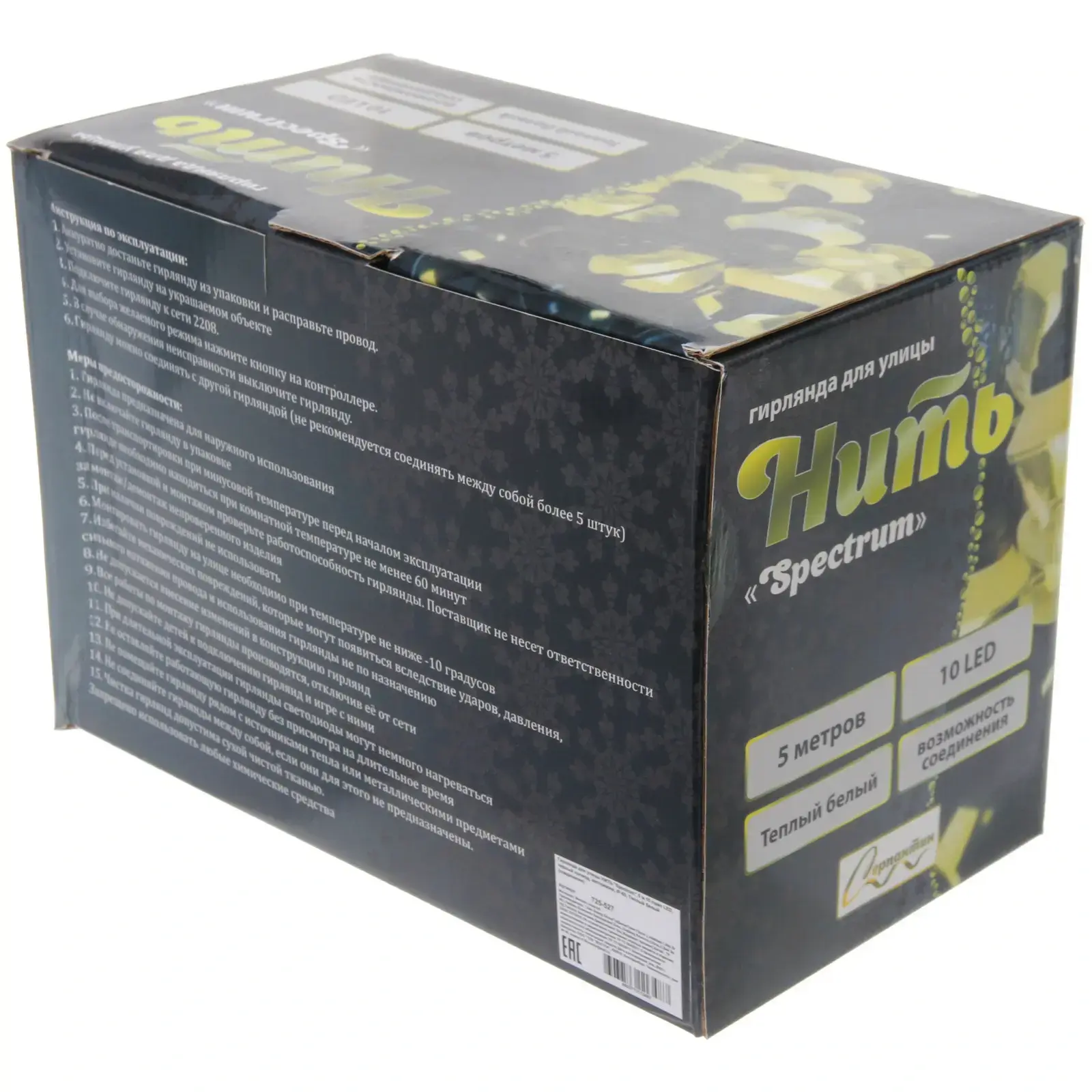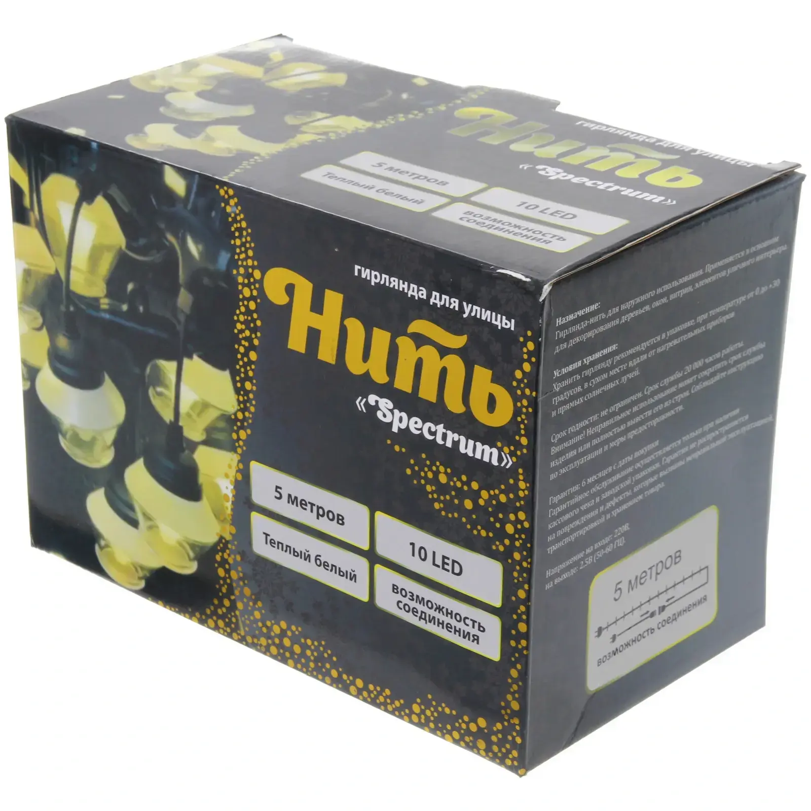 Создайте атмосферу уюта и праздника с гирляндой НИТЬ «Spectrum». Эта гирлянда длиной 5 метров с 10 светодиодами излучает теплый белый свет, который идеально подходит для украшения как внутренних, так и наружных пространств. Благодаря черному проводу и прозрачным лампам, гирлянда гармонично впишется в любой интерьер или экстерьер, добавляя нотку стиля и элегантности.