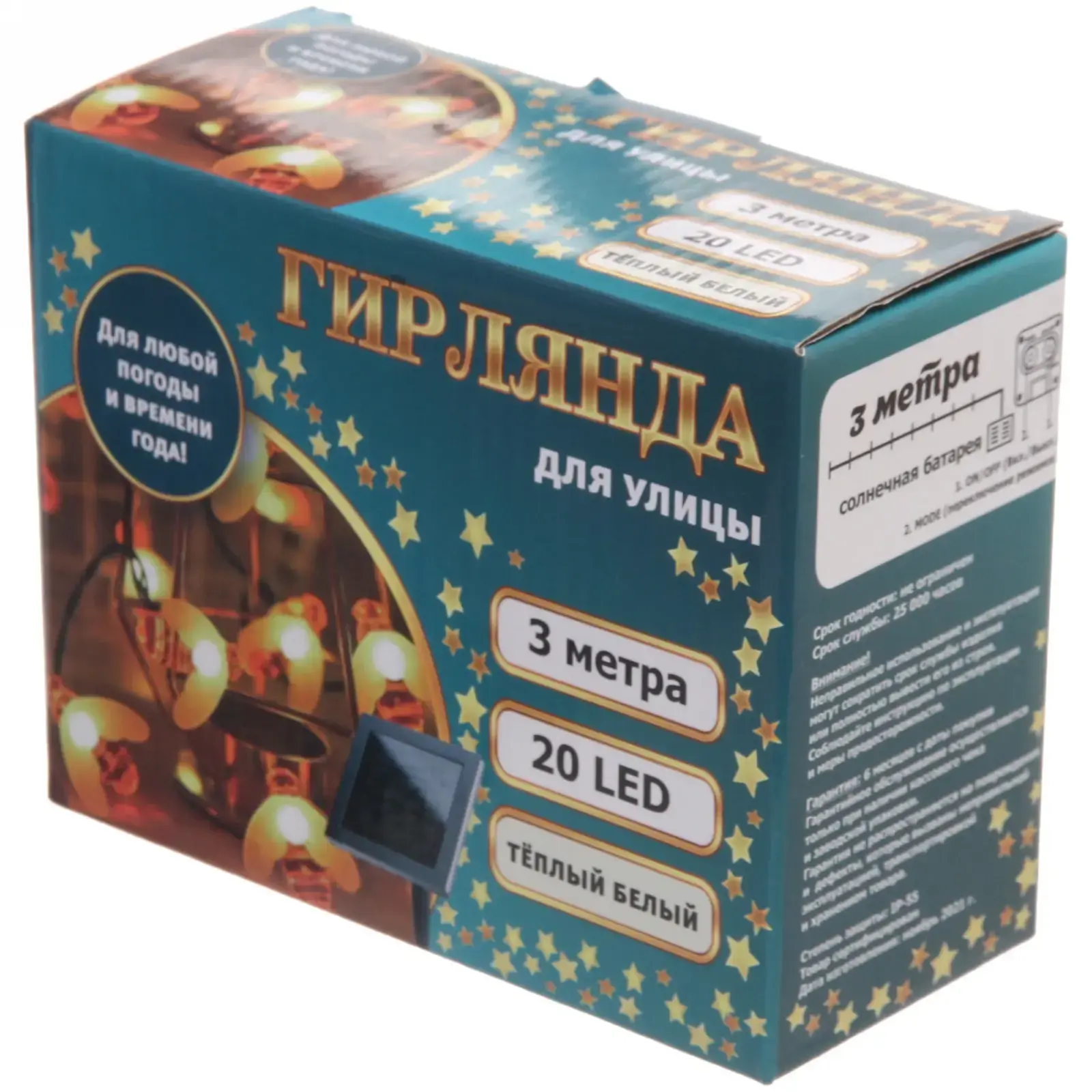 Гирлянда имеет два режима работы: постоянное свечение и мерцание, что позволяет вам выбрать подходящий вариант для любого мероприятия. Она работает от солнечной батареи, что делает её экологически чистым и экономичным решением. В течение дня солнечная панель заряжается, а затем обеспечивает до 10 часов непрерывного освещения в вечернее время. Это значит, что вам не нужно беспокоиться о подключении к электросети — просто установите гирлянду в нужном месте и наслаждайтесь её красотой.