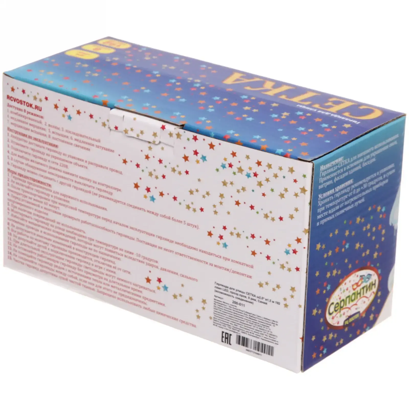 Гирлянда поставляется готовой к использованию. Просто разверните сетку, закрепите ее на поверхности и подключите к сети. Возможность соединения нескольких гирлянд позволяет создавать масштабные световые композиции.