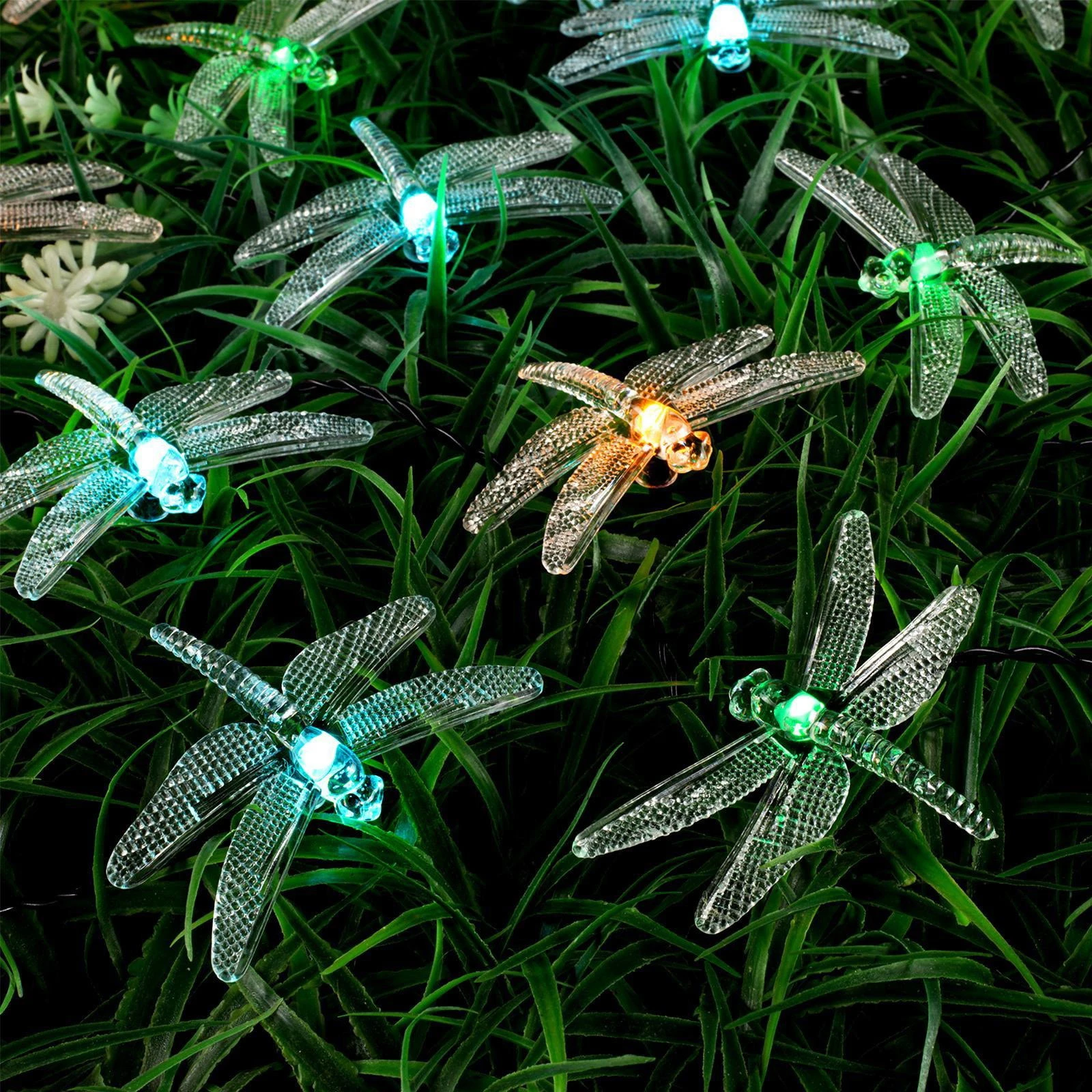 Гирлянда выполнена из качественных материалов: черный провод и пластиковые элементы, что обеспечивает её надежность и долговечность. Многоцветная подсветка создаёт волшебную атмосферу, а детализированные стрекозы добавляют оригинальности. Размеры гирлянды: длина 3 метра, 20 светодиодов, работающих от солнечной батареи. Подходит для использования в любое время года.