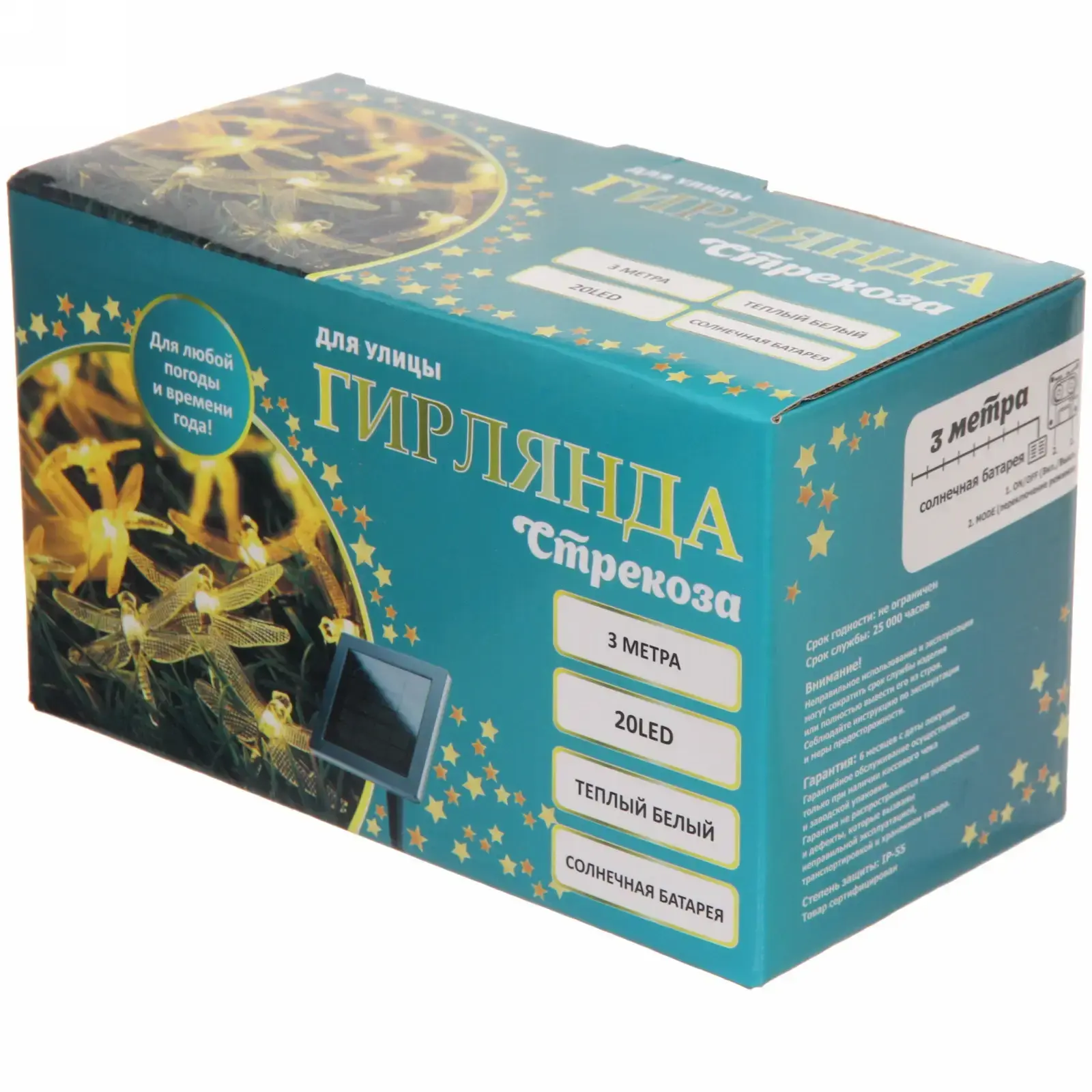 Гирлянда «Стрекоза» обладает степенью защиты IP-55, что позволяет использовать её в любых погодных условиях. Она устойчива к дождю и снегу, что делает её идеальным выбором для уличного использования. Солнечная батарея заряжается в течение дня и обеспечивает до 10 часов работы в ночное время, что позволяет вам наслаждаться её красотой долгое время.