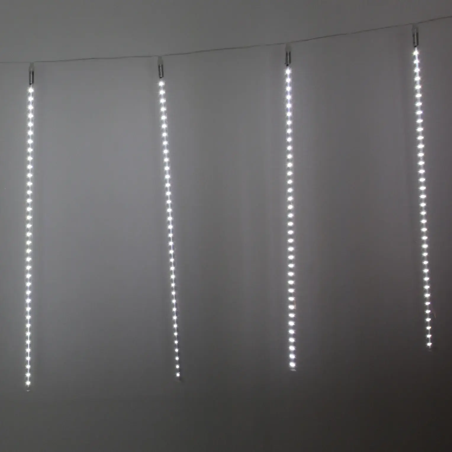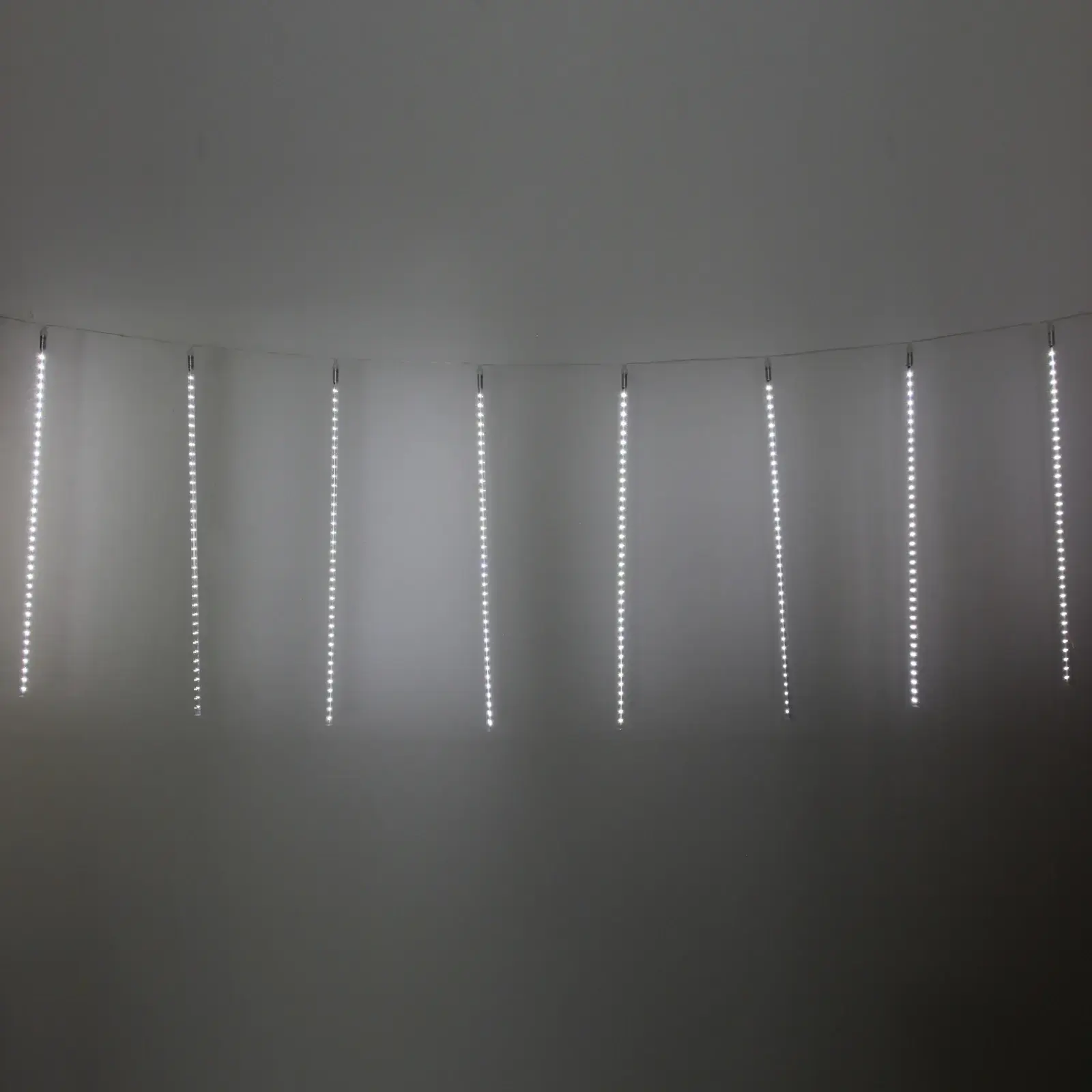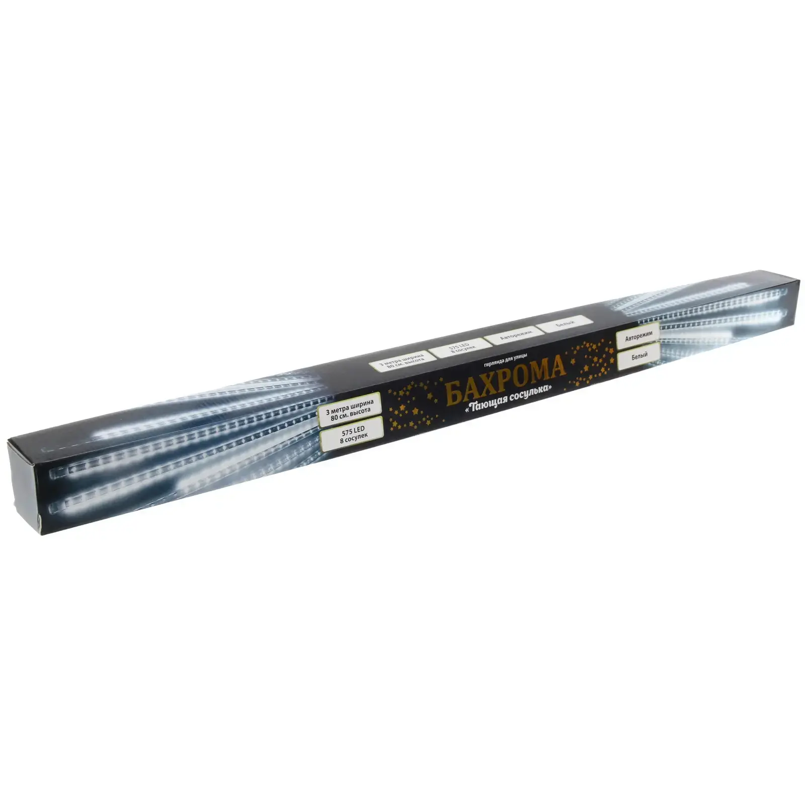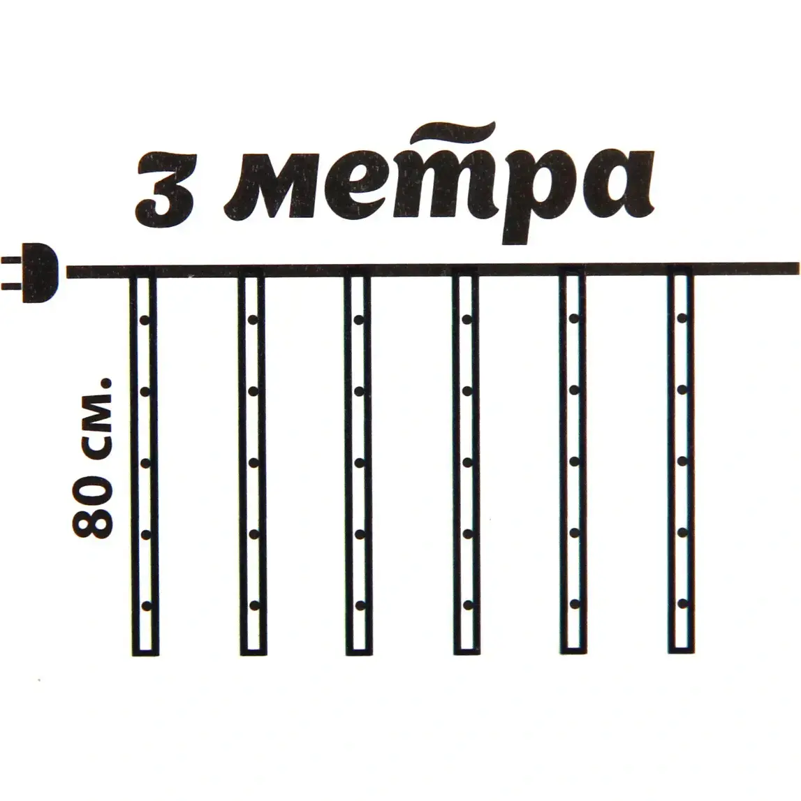 Гирлянда состоит из 8 трубок, каждая из которых равномерно распределяет светодиоды, создавая эффект падающих сосулек. Длина гирлянды составляет 3 метра, а высота каждой трубки — 80 см. Материалы, из которых изготовлена гирлянда, включают металл и пластик, что обеспечивает её прочность и легкость в установке.