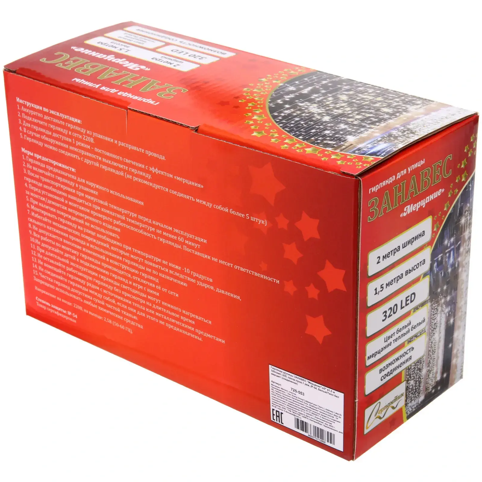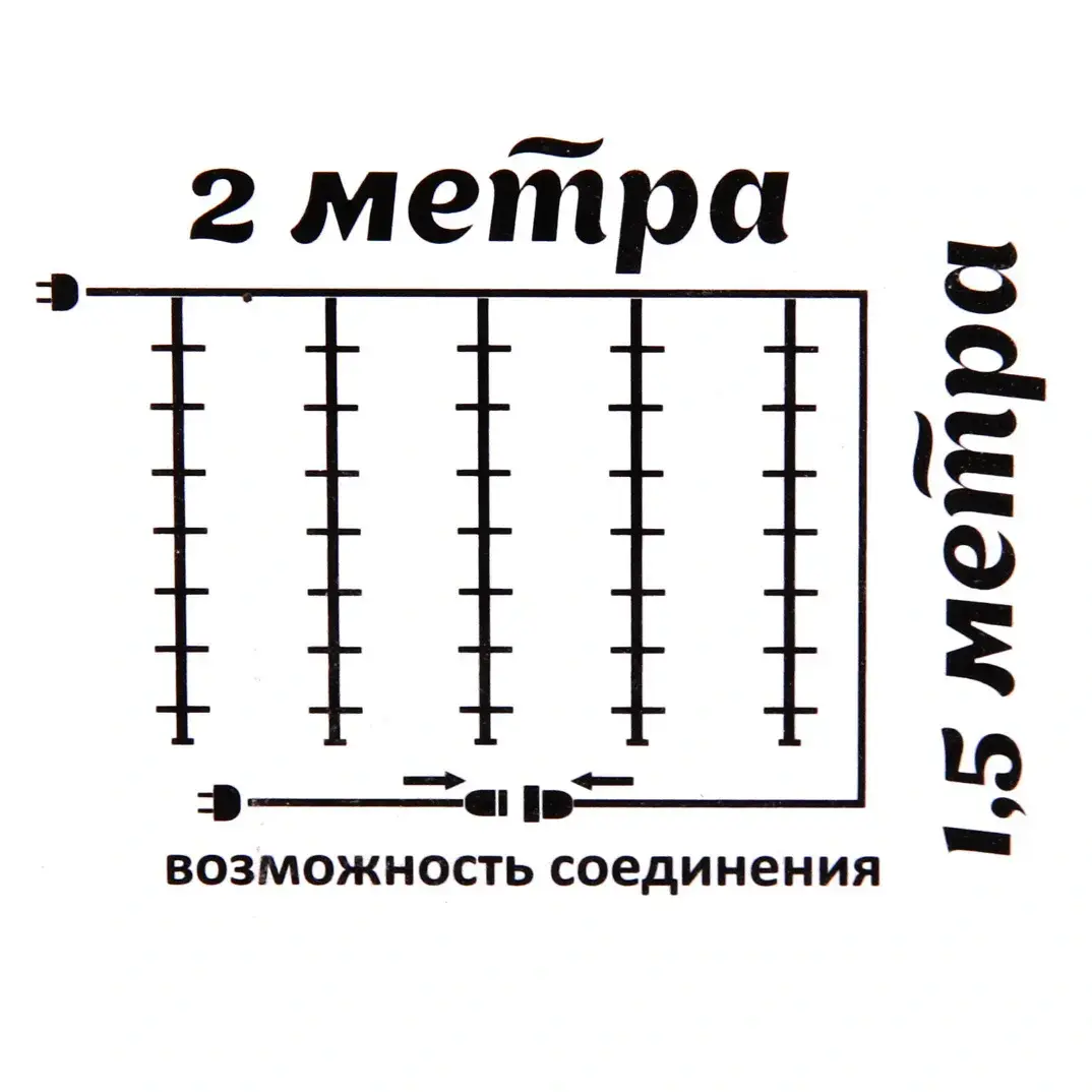 Гирлянда имеет размеры 2 метра в ширину и 1,5 метра в высоту, что делает её идеальной для декорирования окон, балконов, стен и других поверхностей. Она подходит для использования как в помещении, так и на улице, благодаря степени защиты IP-54, что обеспечивает её устойчивость к влаге и неблагоприятным погодным условиям. Гирлянда работает в одном режиме свечения, создавая эффект светового мерцания, который привлекает внимание и создает атмосферу праздника.