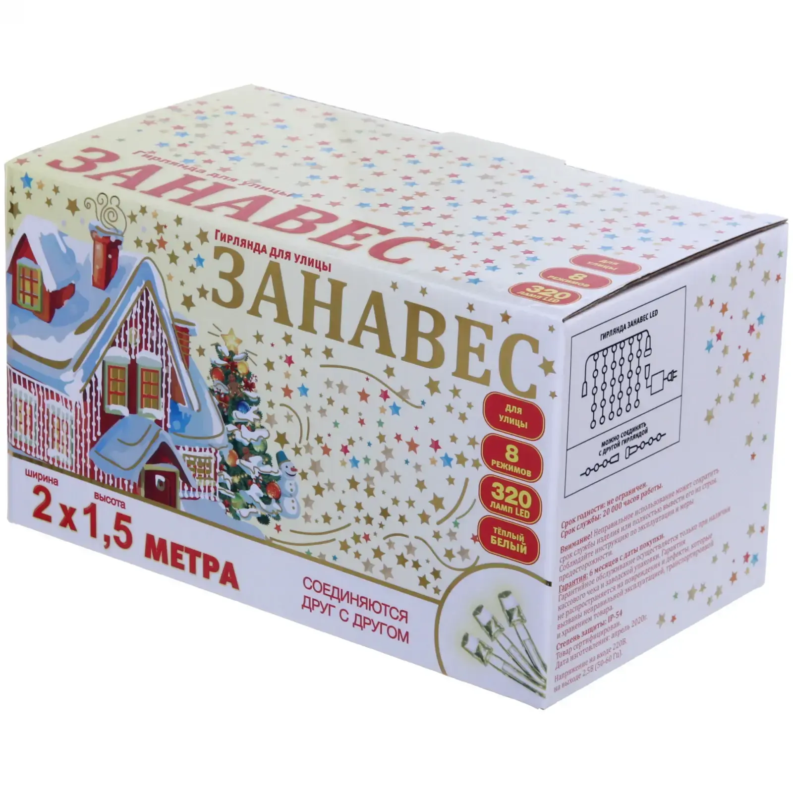 Гирлянда предназначена для уличного использования и имеет степень защиты IP-54, что обеспечивает её надежность в любых погодных условиях. Она идеально подходит для украшения фасадов зданий, окон, веранд и садов. Легкость установки и возможность соединения с другими гирляндами делают её универсальным решением для любого праздника.