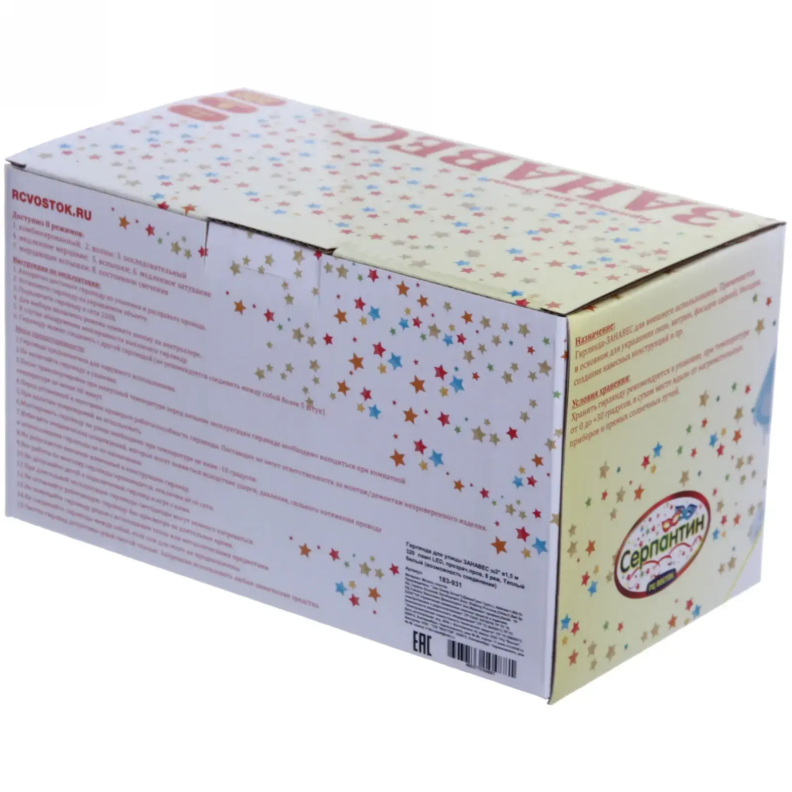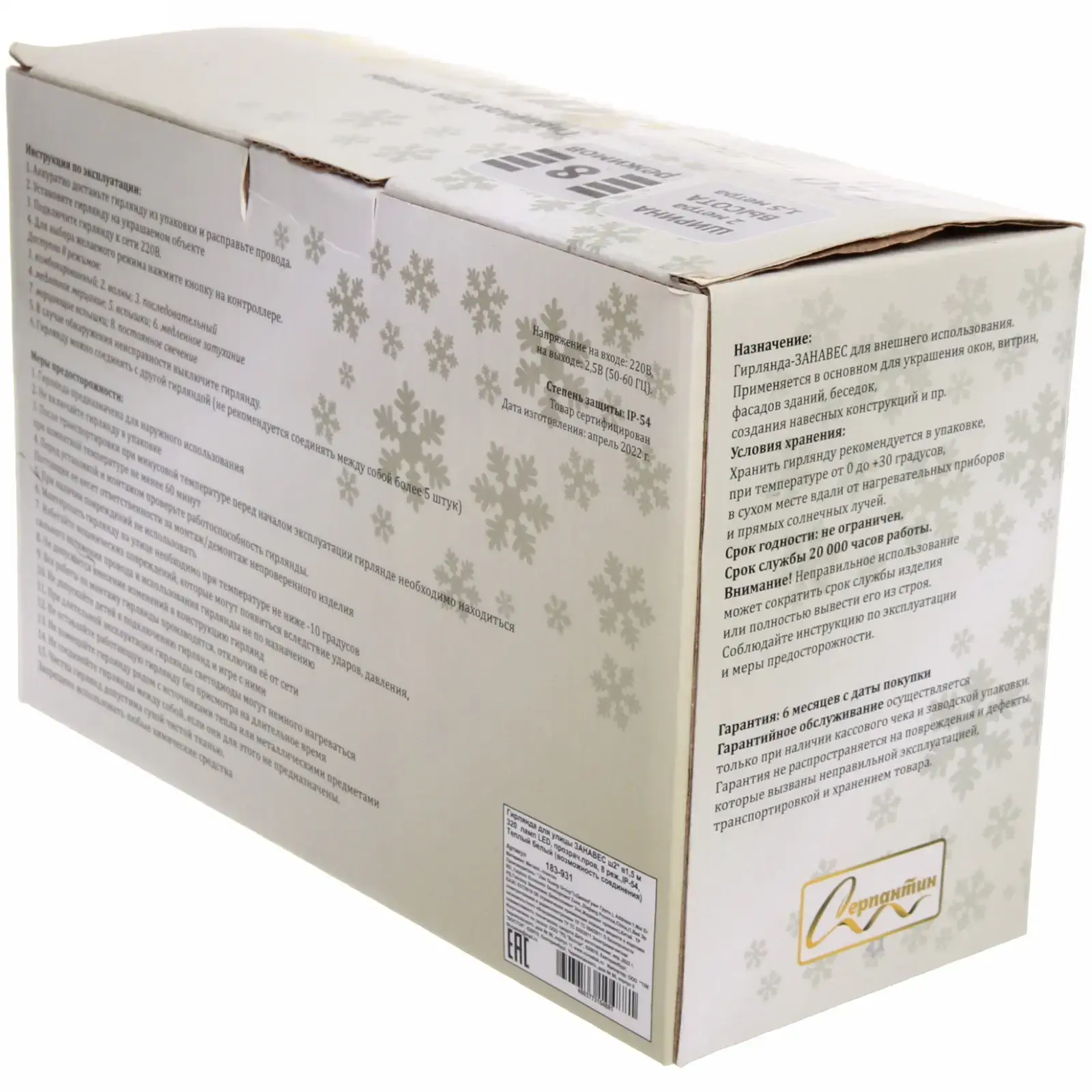 Гирлянда выполнена из качественных материалов: металл и пластик, что обеспечивает её прочность и устойчивость к внешним воздействиям. Упаковка содержит всю необходимую информацию о характеристиках и способах подключения. Не упустите возможность сделать ваш праздник незабываемым с гирляндой 'ЗАНАВЕС'!