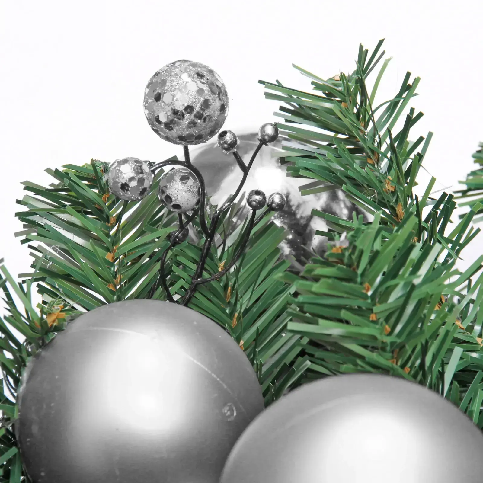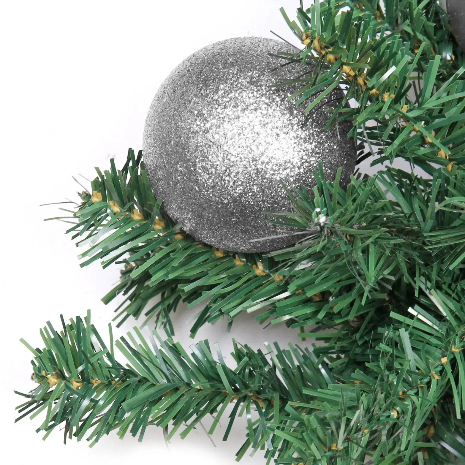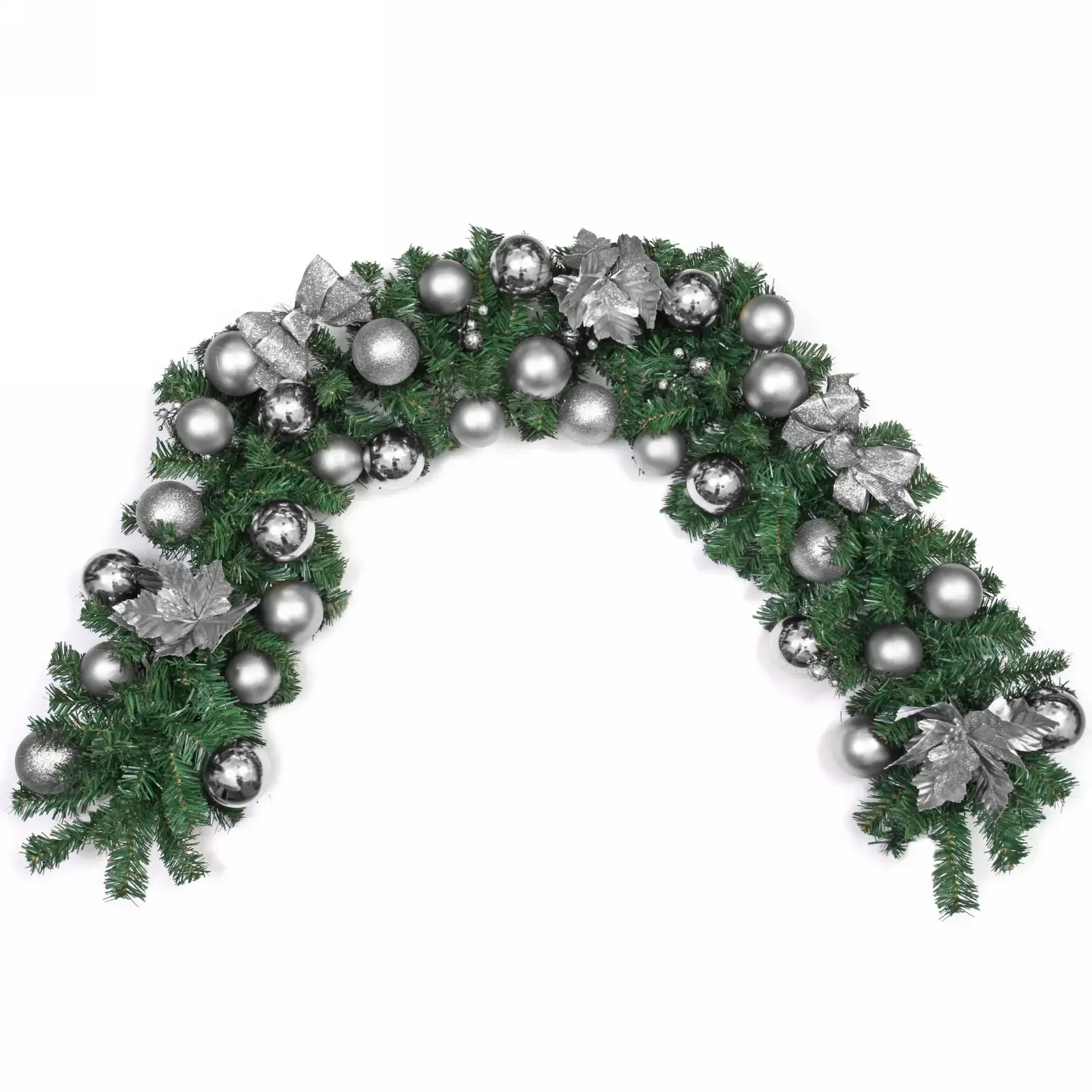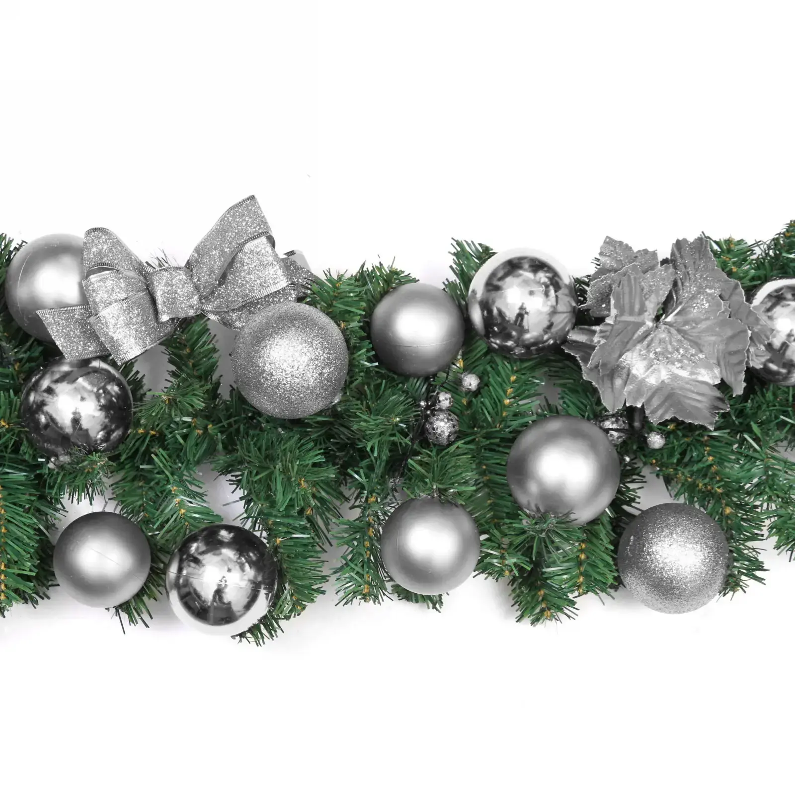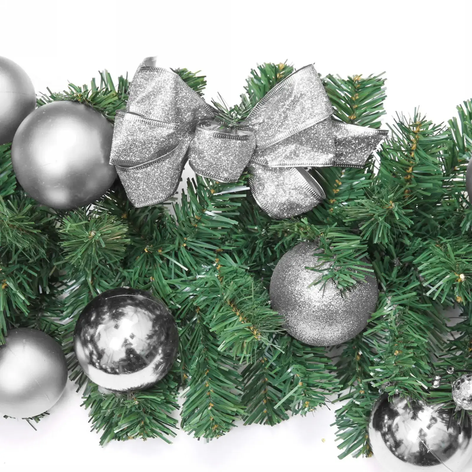 Гирлянда состоит из искусственных хвойных веток, украшенных блестящими серебристыми шарами и декоративными элементами. Основной цвет гирлянды — зеленый, что создает контраст с серебристым декором. Размеры гирлянды: длина 1,8 м, диаметр 30 см. Она станет отличным выбором для создания уютной и праздничной атмосферы в вашем доме.
