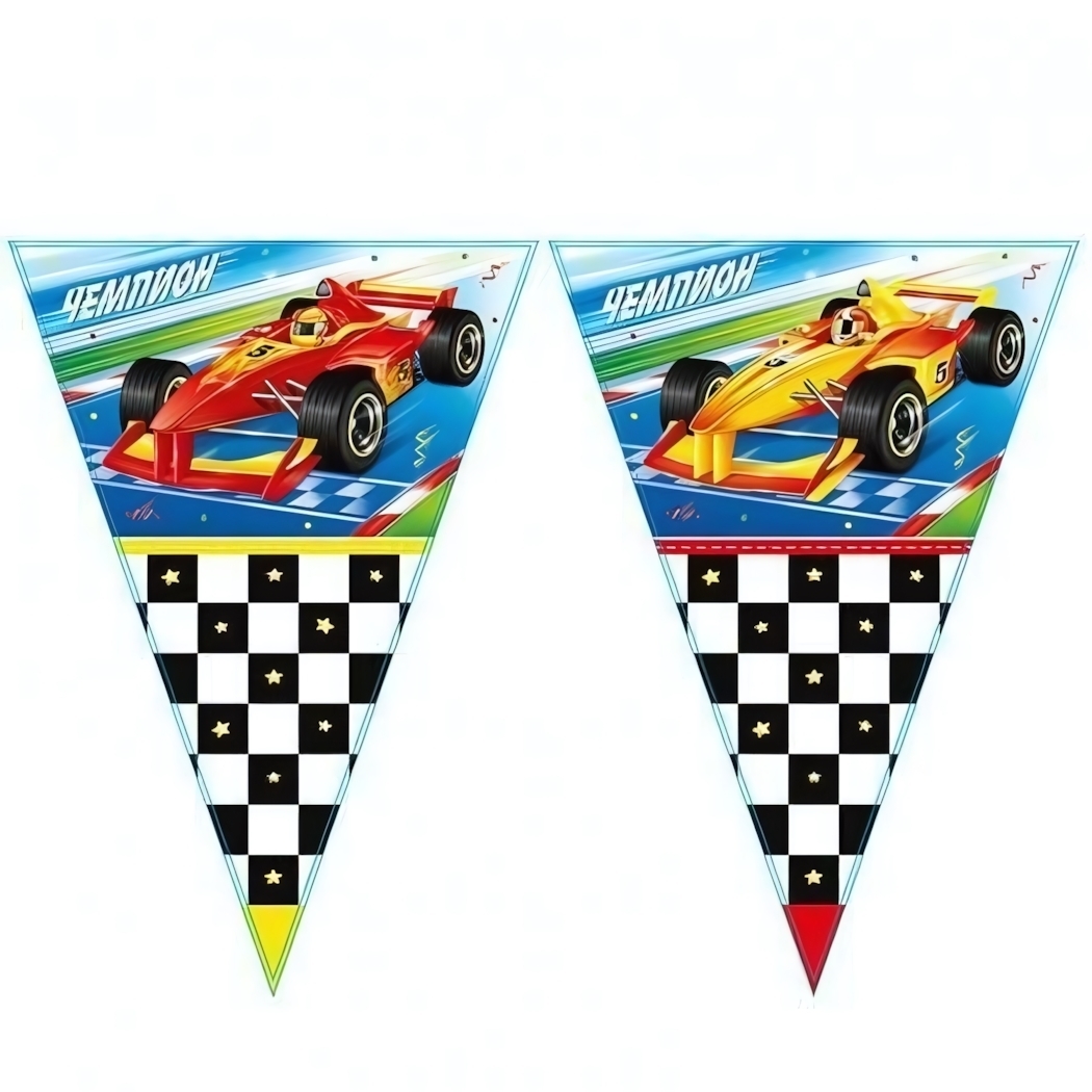 Название «Чемпион» на каждом флаге подчеркивает тематику соревнований и побед. Сочетание узнаваемых персонажей с абстрактными гоночными элементами делает декор уместным как для детского праздника, так и для корпоративного мероприятия автотематики. Яркие акценты в оформлении создают праздничное настроение без необходимости дополнительного декора.