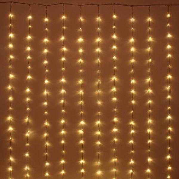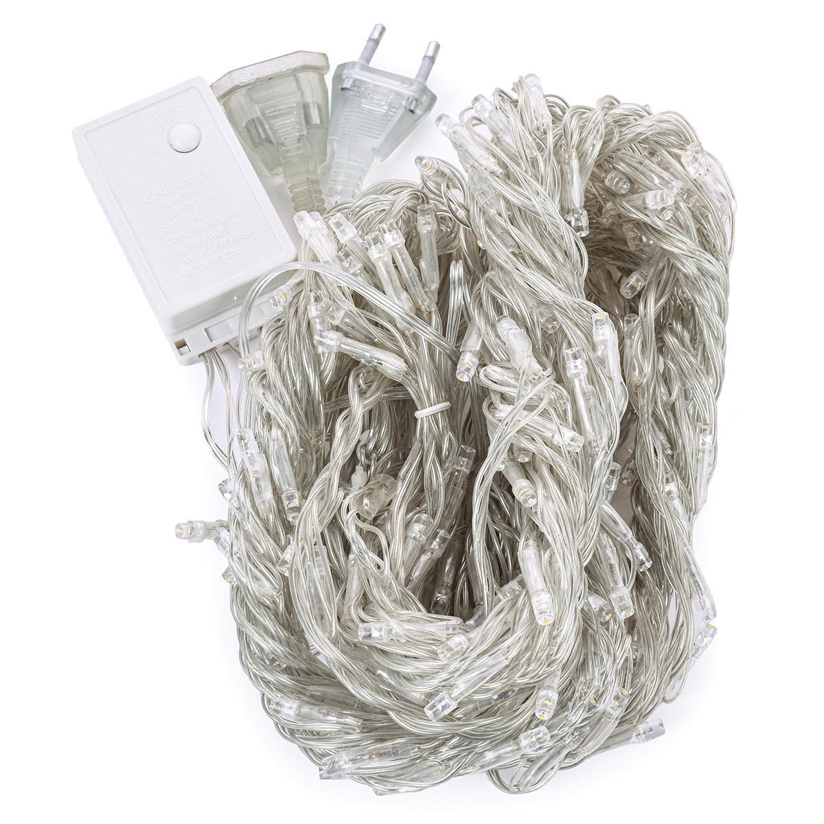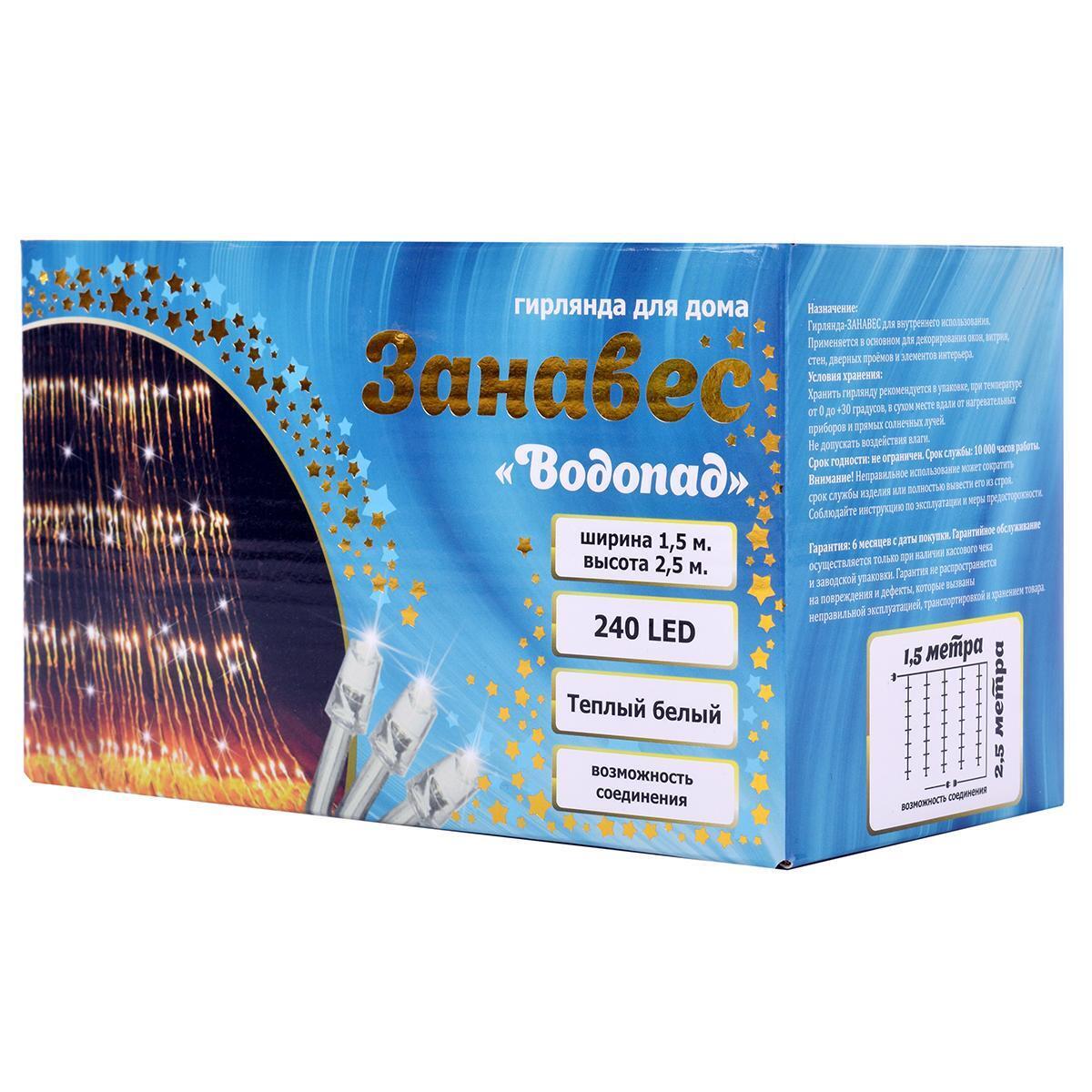 Создайте уютную атмосферу с гирляндой занавес 'Водопад', шириной 1,5 метра и высотой 2,5 метра. С 240 светодиодами, излучающими теплый белый свет, она станет прекрасным украшением для вашего интерьера. Благодаря возможности соединения нескольких гирлянд, вы сможете легко изменить масштаб декора, создавая уникальные световые композиции.