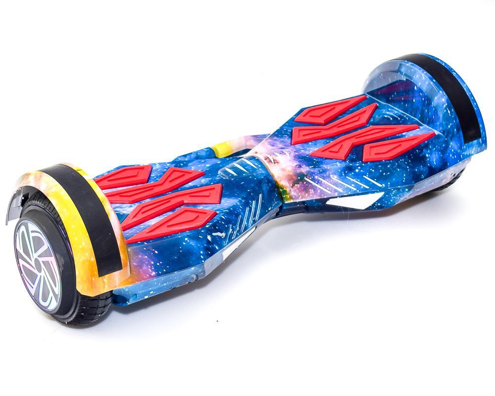 Компактный электротранспорт с диаметром колеса 7 дюймов и длиной 60 см сочетает мобильность, стильный дизайн и надежность. Яркий синий цвет с космическим принтом и красными акцентами выделит вас на прогулке, а прочный пластиковый корпус гарантирует долговечность.