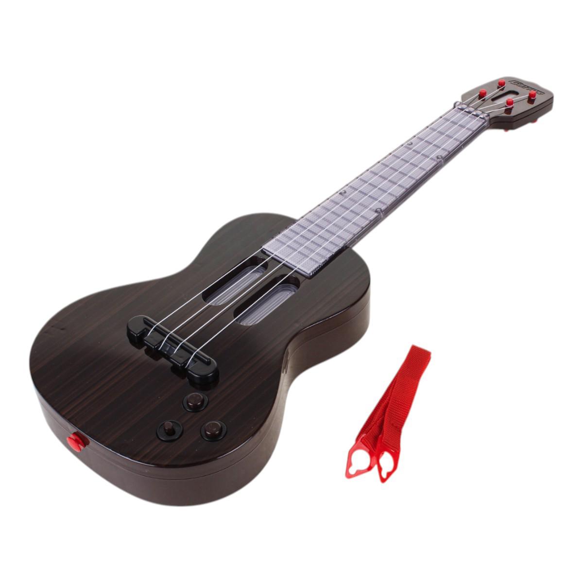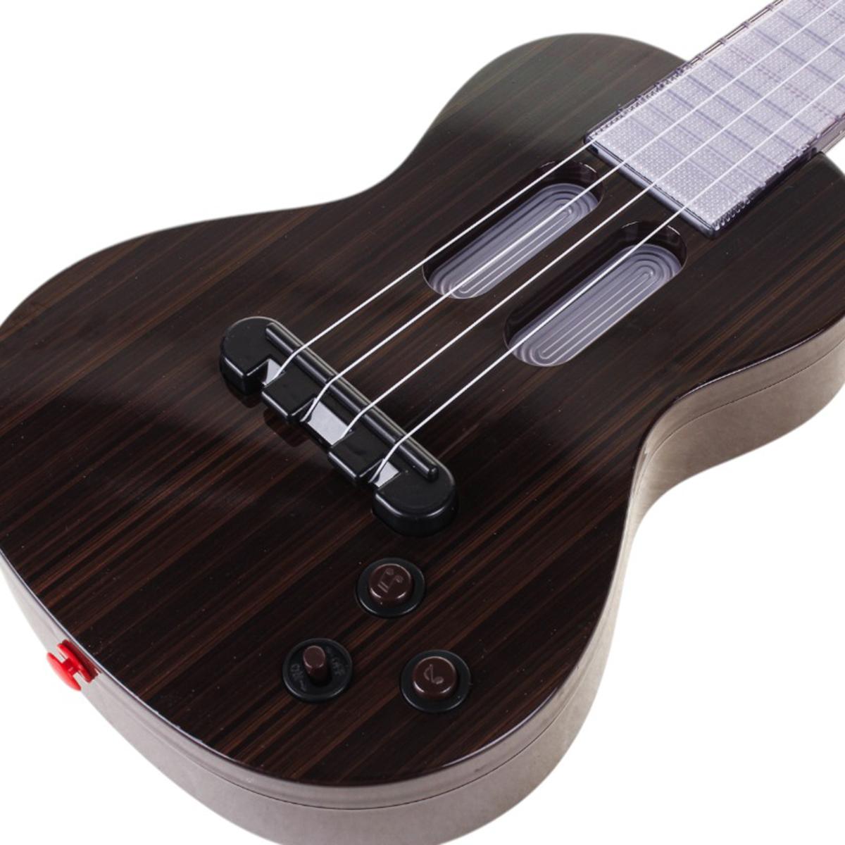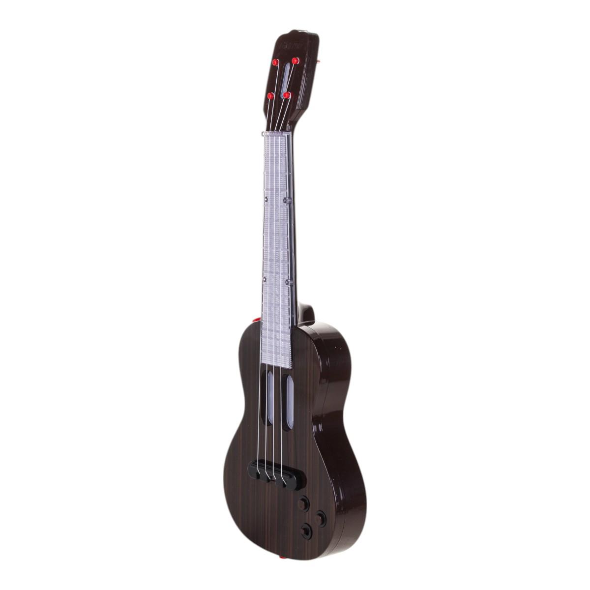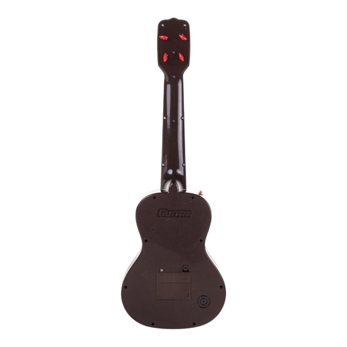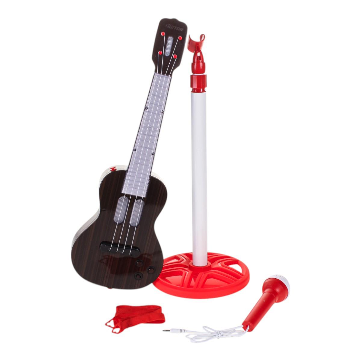 Гитара: 53 × 18 × 4,5 см, темно‑коричневый с черными деталями; корпус пластик. Микрофон на стобуте высотой 90 см, цвет – красный/белый. Набор работает от 3 батей АА (в комплекте не идут). Упаковка: 53 × 5,5 × 22,5 см. Идентификатор – 828‑11.
