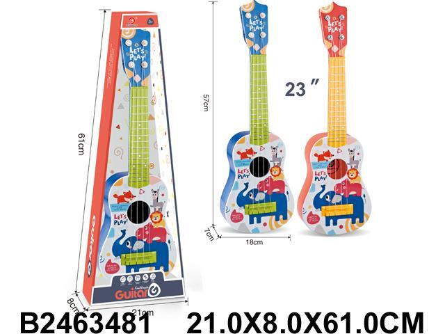 Материал корпуса — пластик. Отгружается один товар, цвет определяется случайным образом. Длина гитары — 57 см, что удобно для игры дома или на улице. Струны и гриф выполнены из материалов, безопасных для ребёнка. Упаковка в виде коробки защищает товар до момента получения и делает его удобным для подарка.