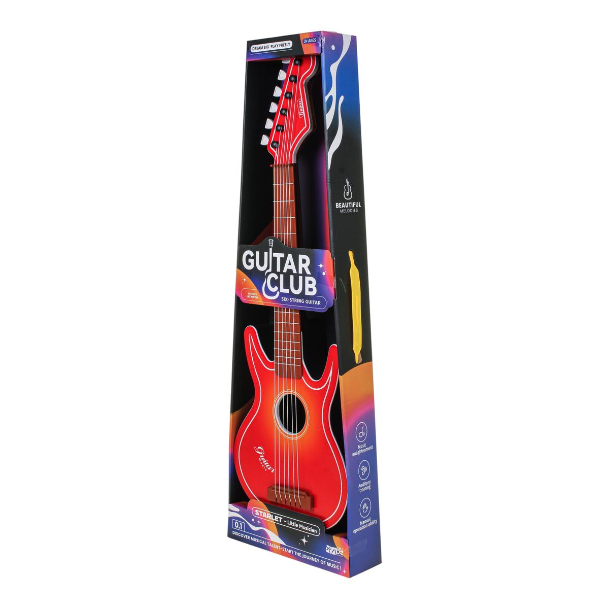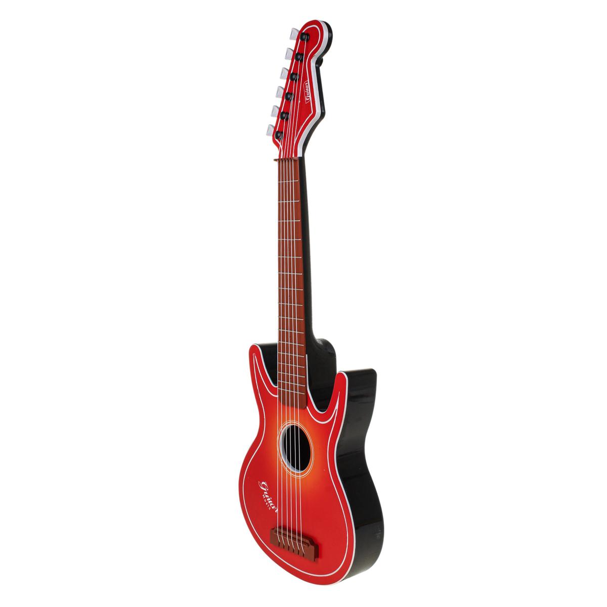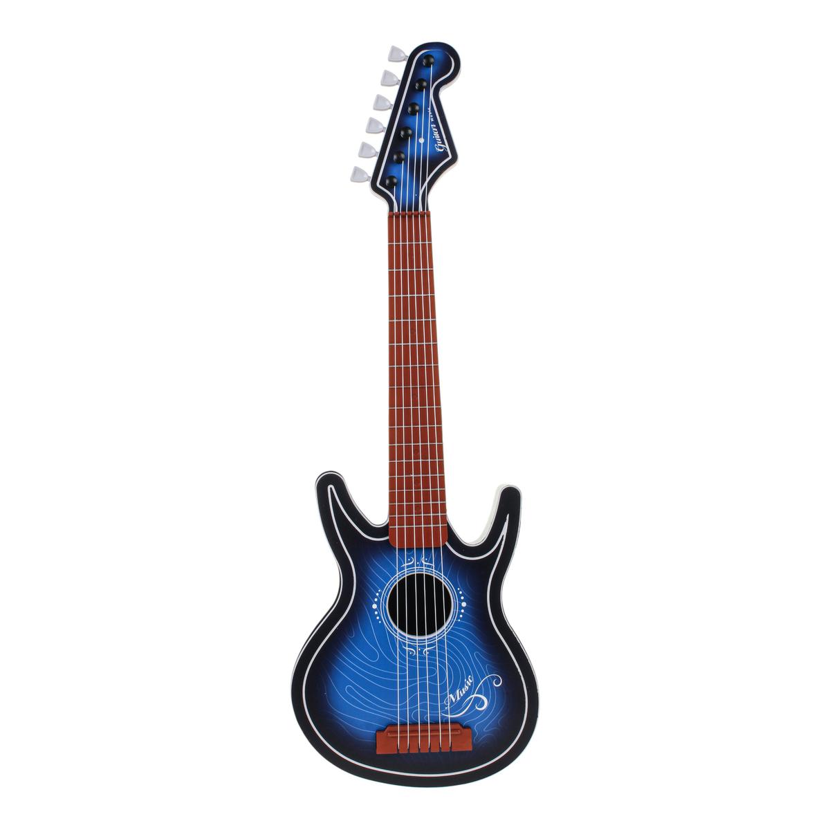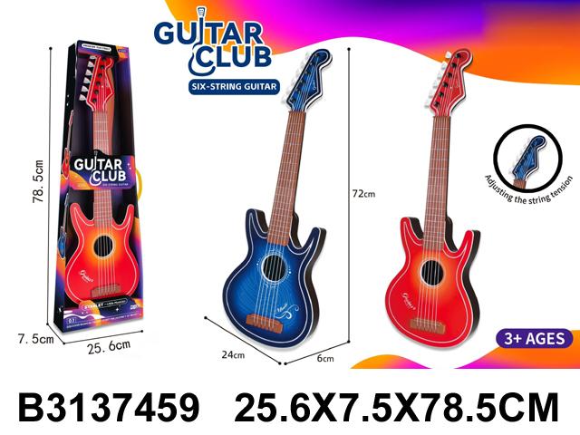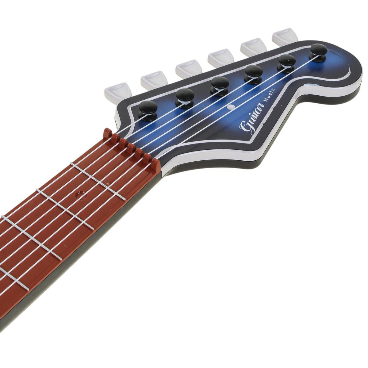 Высота гитары — 72 см, удобный размер для ребенка. Корпус выполнен из прочного пластика, струны надежно закреплены, предусмотрены колки для регулировки натяжения. В комплекте есть ремень для ношения на плече, что делает игру еще более реалистичной и удобной. Товар поставляется в коробке с прозрачным окном — отличный вариант для подарка.