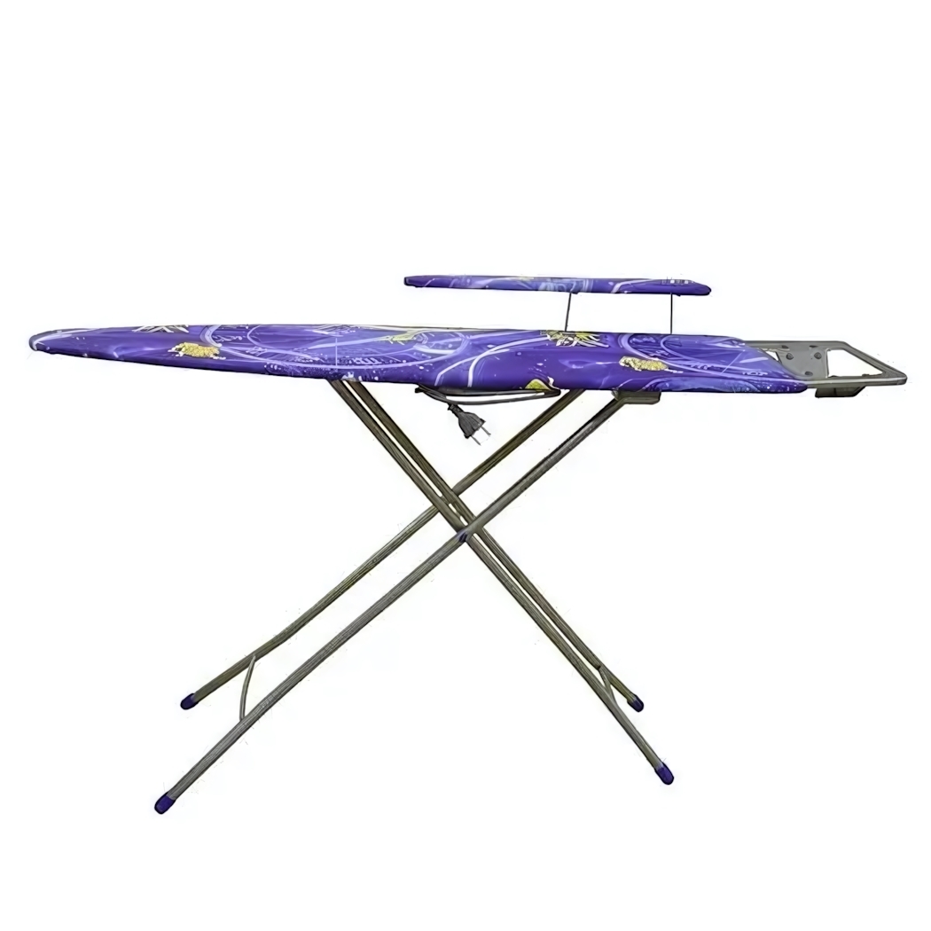 Прочная конструкция с металлическим каркасом и устойчивым покрытием из фиолетового текстиля превратит глажку в комфортный процесс. Встроенная полка для утюга обеспечивает порядок на рабочей поверхности и безопасность при использовании.