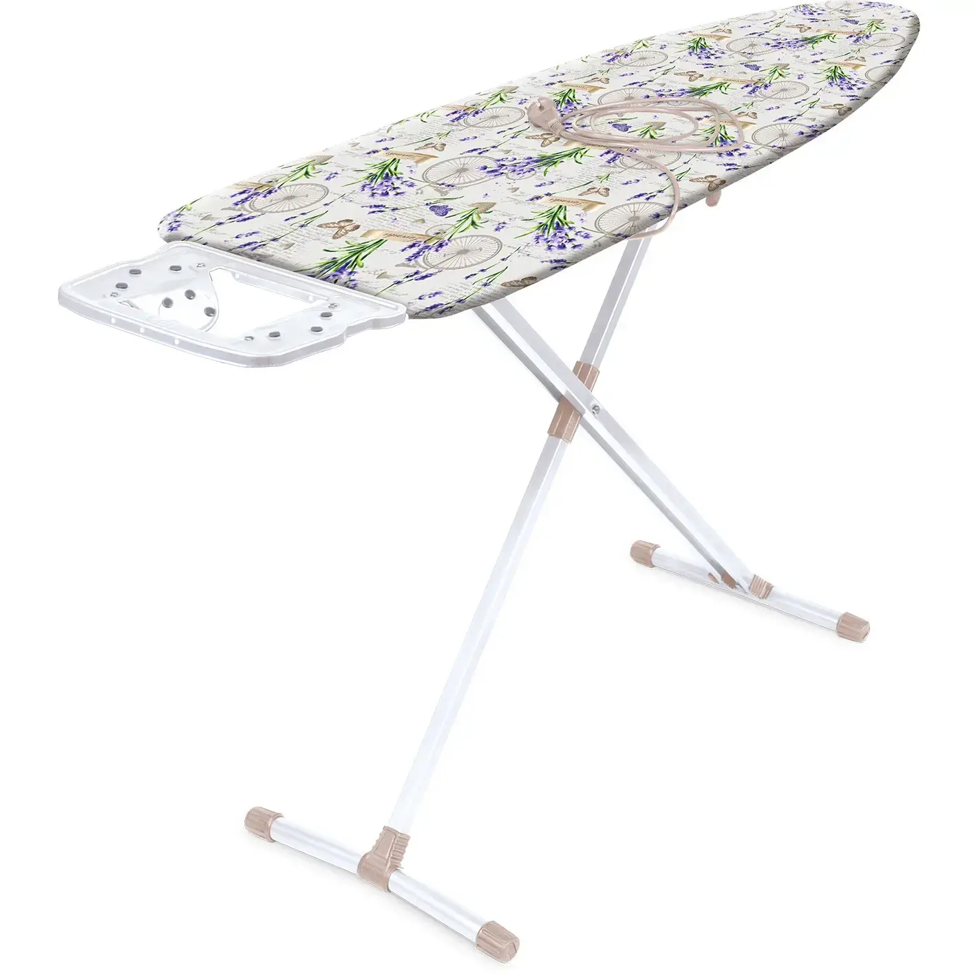 Гладильная доска имеет надежную конструкцию, которая обеспечивает стабильность и безопасность во время работы. Металлический каркас с белым покрытием не только прочен, но и легко вписывается в любой интерьер. Чехол с цветочным узором добавляет эстетическую привлекательность и делает процесс глажки более приятным.