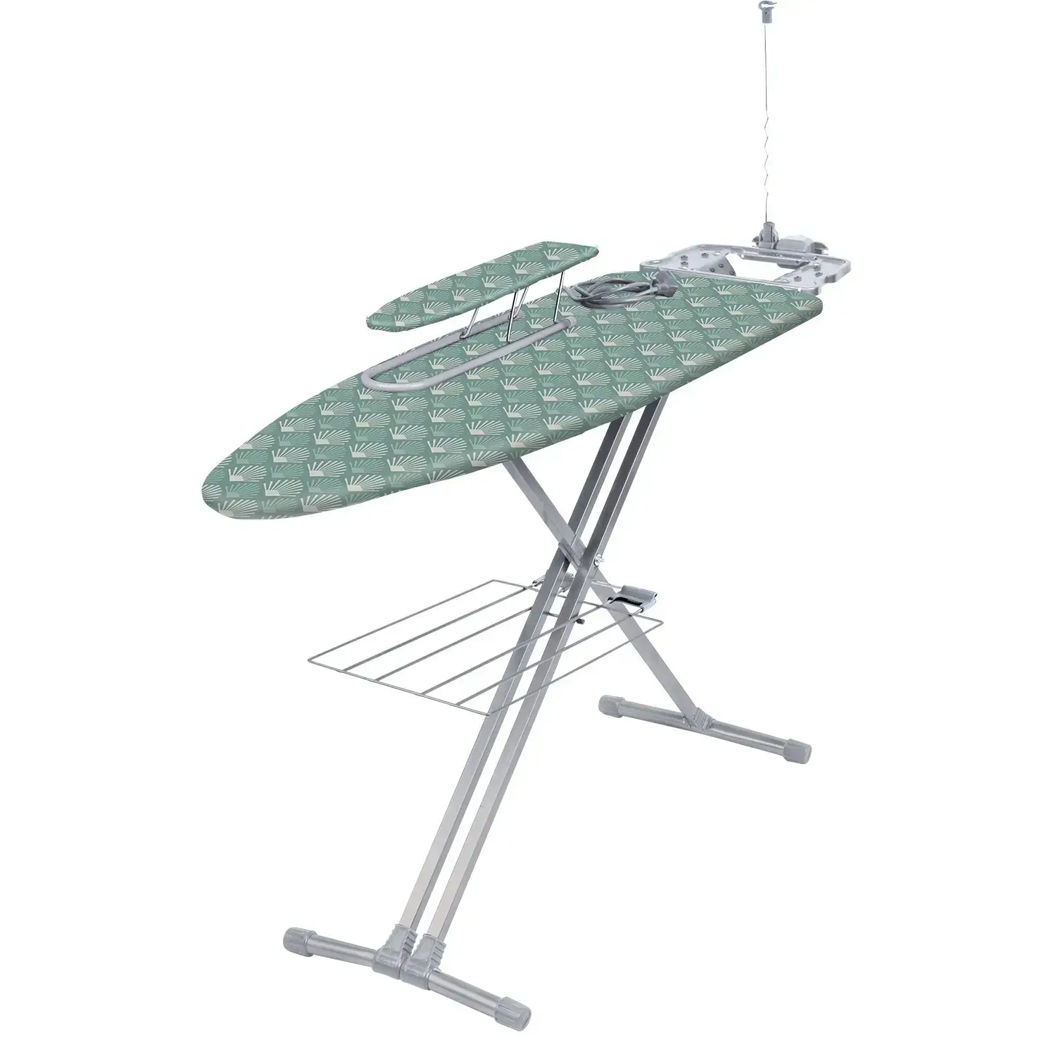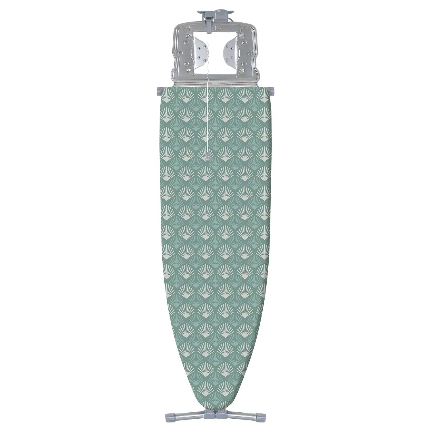 Особенности модели: металлическое основание, покрытие из ткани зеленого цвета с белым узором, наличие металлической полки, держателя для провода и устойчивых опор с пластиковыми накладками. Точный размер не указан, но изделие предназначено для домашнего применения и отлично справляется с любой тканью.