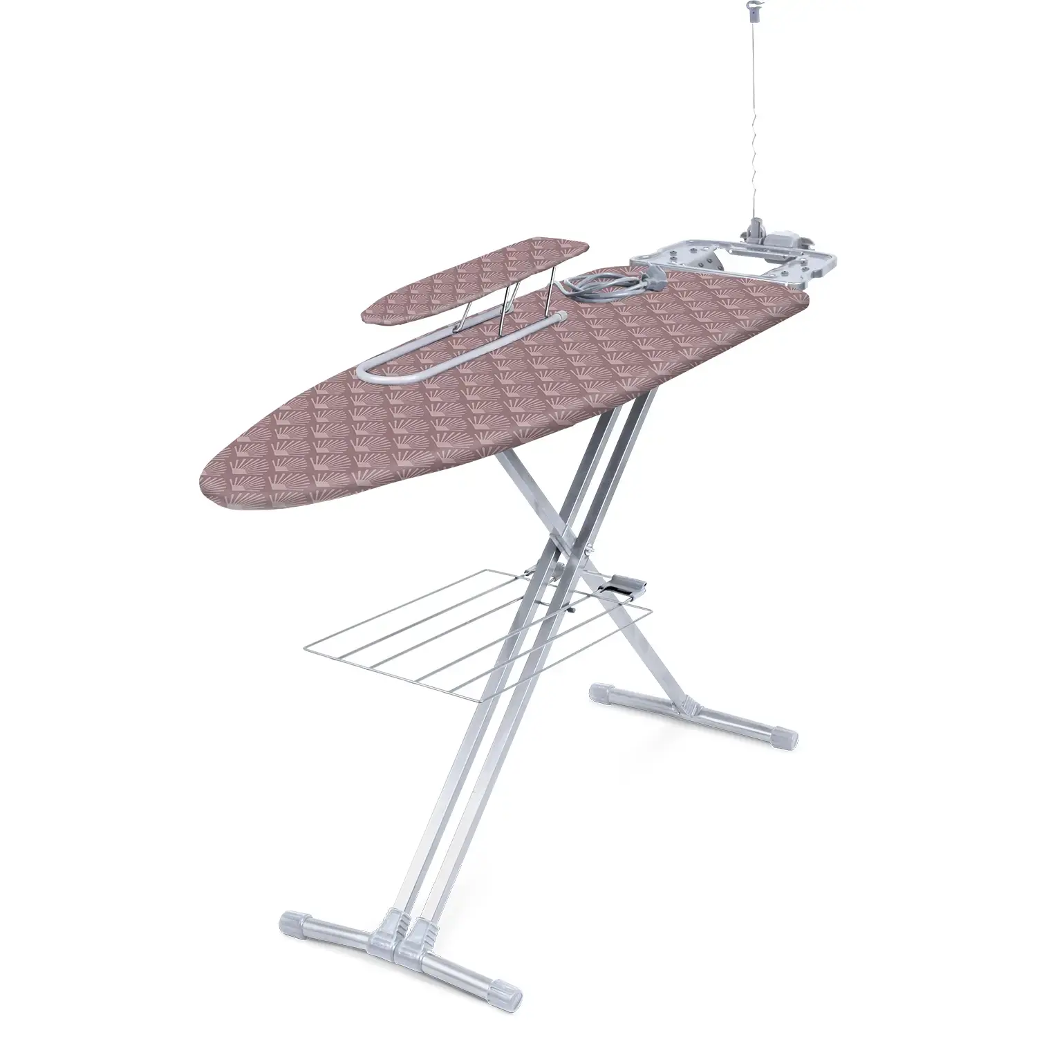 Овальная форма гладильной поверхности удобна для глажки вещей разных размеров. Металлический каркас серебристого цвета придаёт устойчивость и долговечность, а пудровый оттенок текстильной поверхности подчёркивает уют в доме. Максимальная нагрузка — до 25 кг, что делает доску практичной для ежедневного использования.