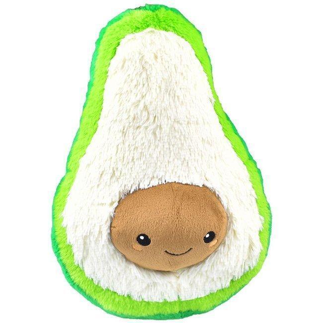 Игрушка высотой 26 см удобна для объятий и переноски. Сочетание зеленого, белого и коричневого цветов точно передаёт образ спелого авокадо. Благодаря плоскому основанию может устойчиво располагаться на полках или кровати.
