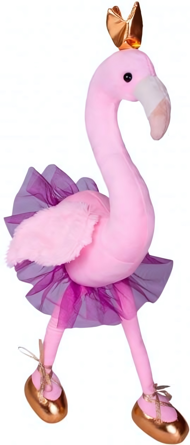 Особенностью модели является реалистичный дизайн: яркий фиолетовый фламинго с длинными ногами, украшенное золотой короной и юбкой из сетчатого материала. Надежное крепление деталей, отсутствие острых элементов делают ее полностью безопасной для малыша.