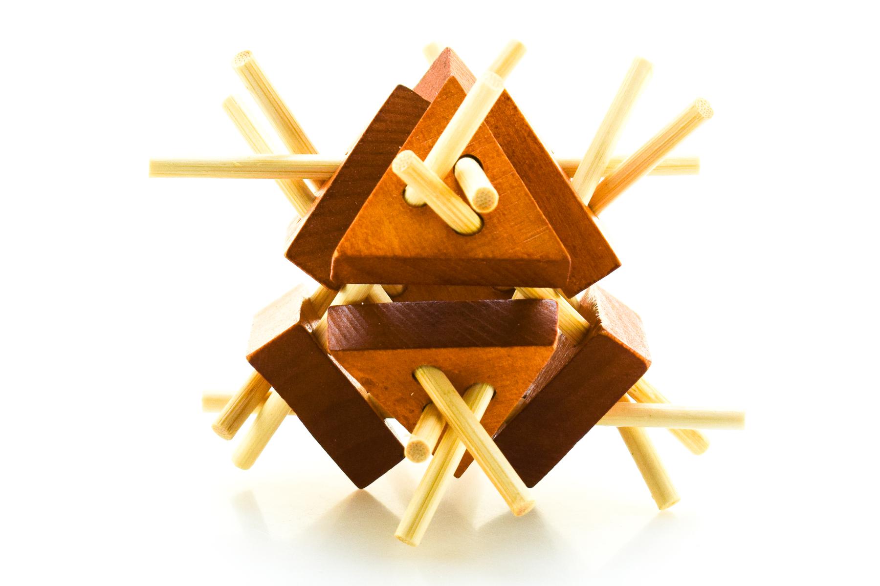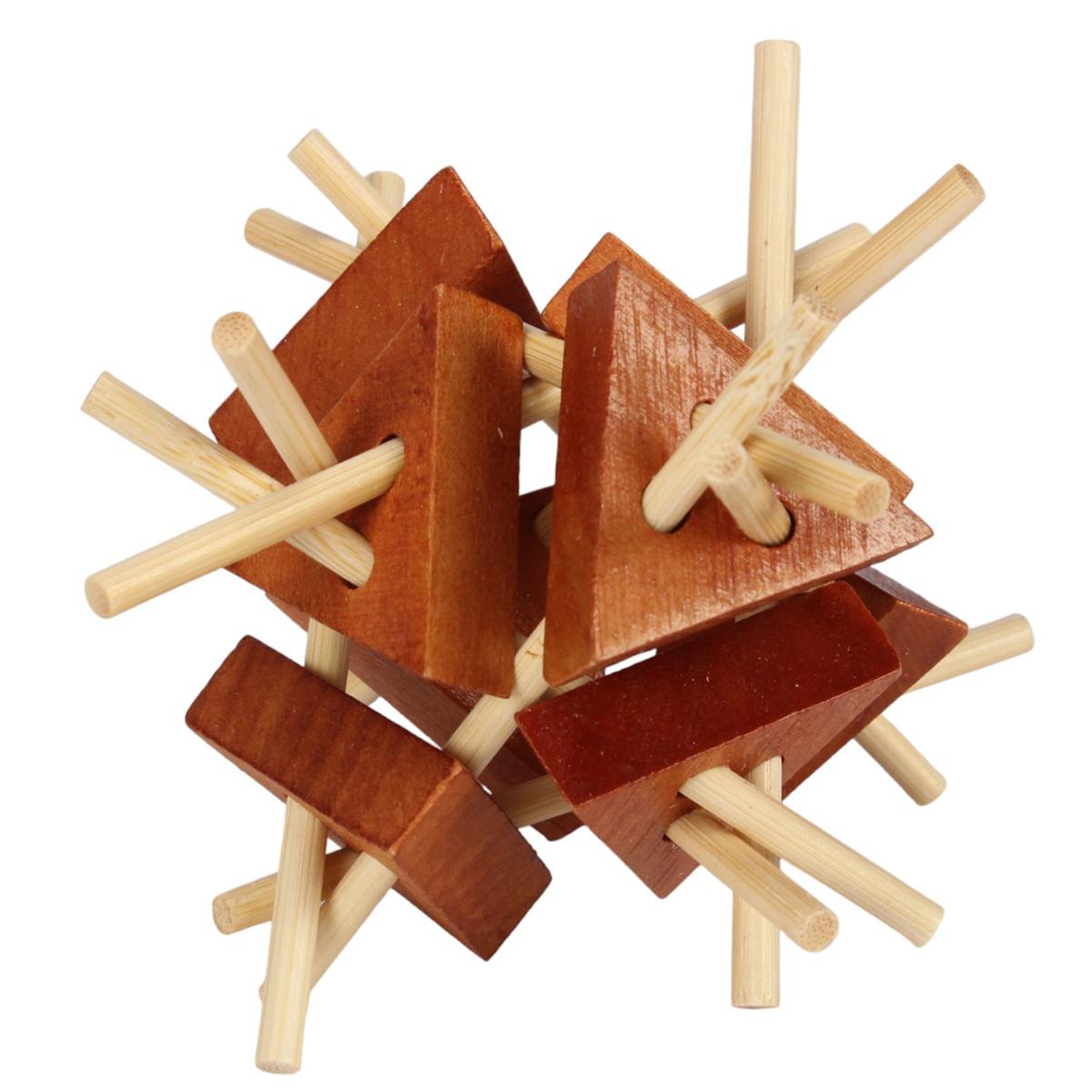Размер головоломки составляет 6,5 см, что делает её удобной для маленьких ручек. Игрушка выполнена из дерева, что гарантирует её прочность и долговечность. Деревянные элементы имеют различные формы, что добавляет интереса в процессе игры и способствует развитию творческого мышления.