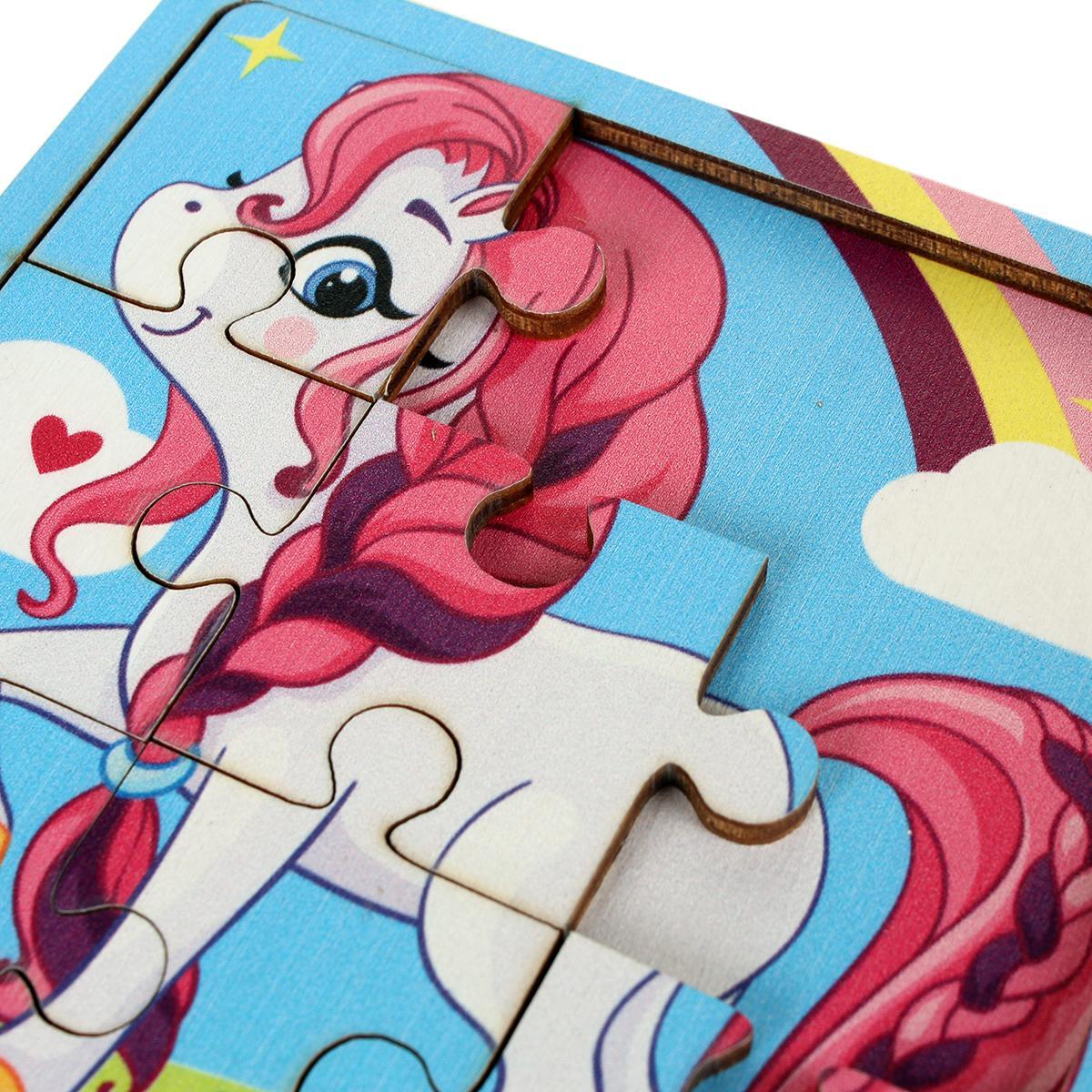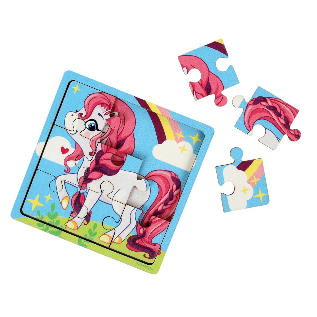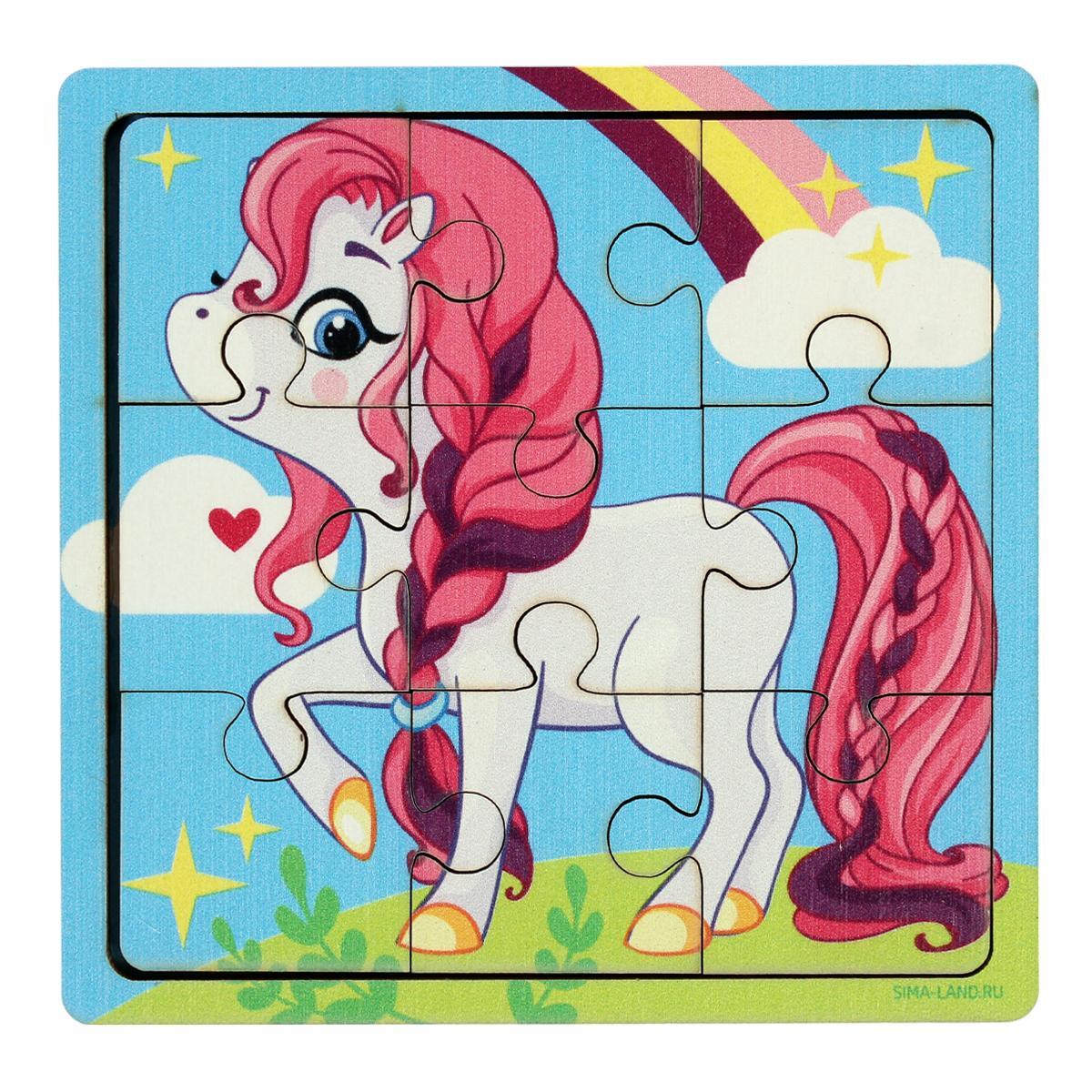 Пазл деревянный детский, развивающая игрушка "Пони с радугой", 9 элементов, 10х10 см, экокраска